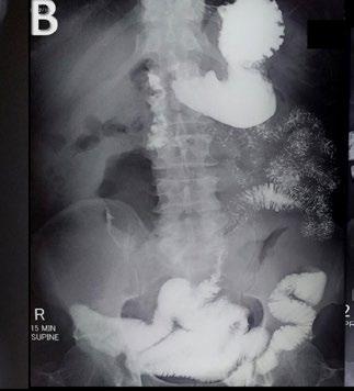 A) Reveals a large soft tissue radio-opacity of approximate size 15x10 cm in right lumbar and umbilical quadrants with a central lucent area. B) Small bowel series show normal gastric distensibility and emptying. There is faint opacification in the core of lesion. The mass is displacing ileal loops to the left.