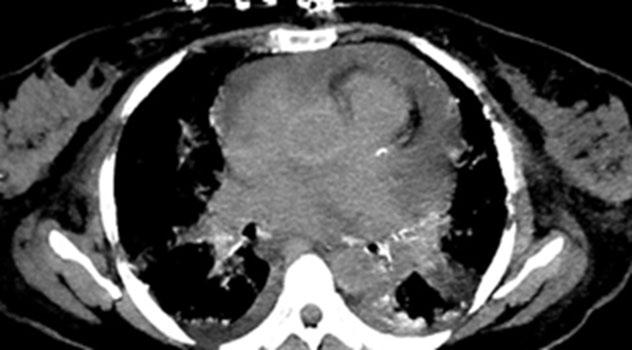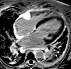 Figure 2: Chest CT (non-contrast study) showing pericardial effusion.delineate the extent of disease. The typical appearance of cardiac MRI is a hyperintense mass on T1-weighted images, and hypointense on T2-weighted images, with heterogeneous enhancement following gadolinium administration. Periarterial infiltration of the coronary arteries has been described in up to one-third of patients with ECD, most commonly affecting the right coronary artery, and may cause vascular stenosis and territorial ischaemia. Valvular involvement in ECD is also reported, with the most common valve involved being the mitral valve. It can present with thickening and stenosis of the valve, and progress to valvular insufficiency.4 Myocardial infiltration in ECD is rare, but can lead to cardiac dysfunction, arrhythmias, and heart failure. Patchy late gadolinium enhancement of the myocardium in patients with ECD may also be visualised in a non-coronary distribution. The myocardial infiltration in ECD involves the right atrium, and presents as an ill-defined, heterogeneous mass with variable signal intensity, and can mimic malignancy. Cardiac MRI, in the authors’ case, showed diffuse infiltration in the right atrial, right ventricle myocardium, and aortic root. On functional cardiac MRI, systolic function was impaired, with reduced ejection fraction.5-8