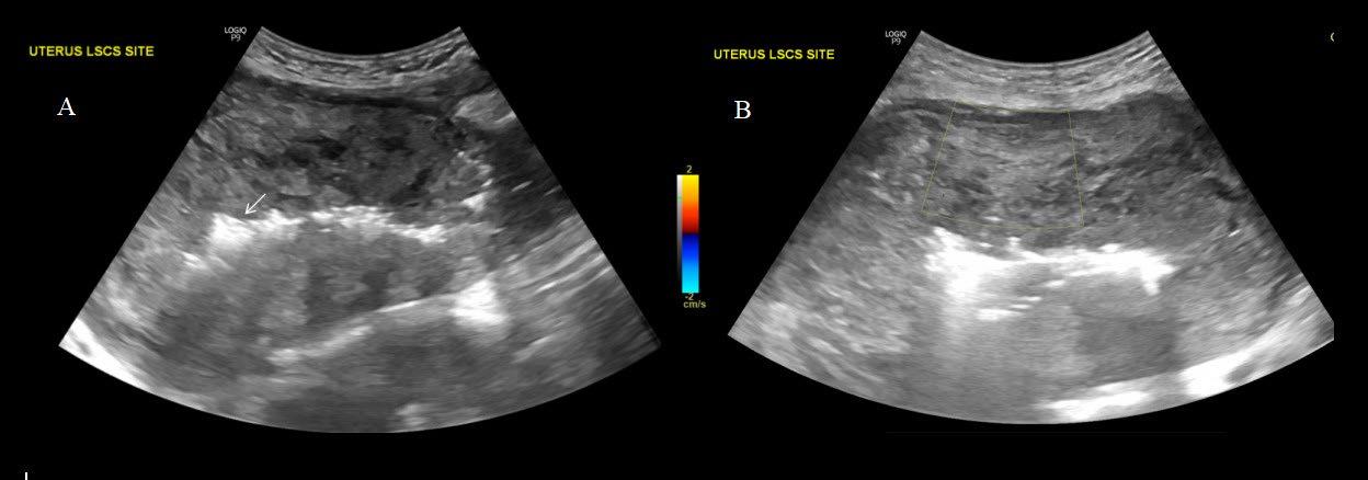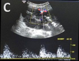 A) These show a well-defined, heterogeneously hypoechoic, lobulated solid lesion, with central necrotic areas. B) There are linear hyperechoic areas with dirty posterior acoustic shadowing in the core of lesion, suggestive of luminal air. C) Colour doppler shows vascularity within the lesion.