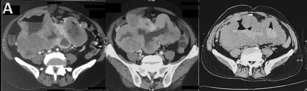 On pre-contrast radiograph (Figure 2A), there was a large abnormal soft tissue opacity of size 15x10 cm in the umbilical and right lumbar quadrant, with a central lucent area. On small bowel series (Figure 2B), gastric distensibility and emptying was normal. The core of the mass showed faint contrast opacification. The mass had displaced the ileal loops to the left. To radiologically confirm the diagnosis, and plan surgical resection of the mass, a contrastenhanced CT (CECT) abdomen with oral contrast was performed. Axial sections of the CECT abdomen (Figure 3A) showed a large, welldefined, heterogeneously enhancing, lobulated exophytic mass, with the central necrotic area arising from the small bowel loops occupying the umbilical and both lumbar quadrants. The central core of the lesion demonstrated contrast filling with air-contrast level. There were no calcifications. There were no enlarged surrounding mesenteric or retroperitoneal lymph
