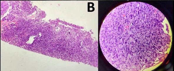 Histopathology (Figure 3B) revealed spindled shaped cells arranged in sheets, whorls, and vague storiform pattern. Individual spindle cells had ovoid to elongated, blunt ended pleomorphic nuclei, with prominent nucleoli. The cells also showed a moderate amount of fibrillary eosinophilic cytoplasm and vacuolations. There were abundant blood vessels in the surrounding stroma. Histopathological findings were suggestive of a spindle cell tumour. The sample was c-KIT positive. Hence, the diagnosis of GIST was confirmed. The patient was given imatinib after the surgical excision of the mass.
