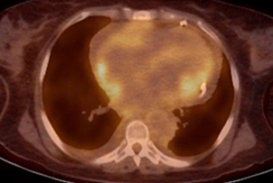 A 54-year-old female with a history of suspected IgG4-related sclerosing disease, who had been struggling with multisystem symptoms for approximately 4 years, presented with worsening diplopia, fever, bone pain, acute kidney disease, arrythmia, and dyspnoea. Patient blood panel revealed haemoglobin of 10.4 g/ dL. Urine analysis and infection panel were normal. Immunological studies of serum IgG4 level were normal (16 mg/dL), and serum β2 microglobulin levels were raised (10.2 mg/L). Positron emission tomography (PET) and CT scans revealed hypermetabolic disease in the right kidney, bilateral femurs, and periaortic and pericardial regions. The patient underwent orbitotomy. Mutational analysis showed a BRAF V600E mutation. Femur and renal biopsies were performed, which diagnosed Erdheim–Chester disease (ECD). The patient also developed recurrent pericardial effusions that further confirmed the authors’ suspicions. Cardiac MRI was performed on the MAGNETOM Sola 1.5T MRI system (Siemens Healthineers, Erlangen, Germany), which revealed hyperintense signal within the atrioventricular groove surrounding the right coronary artery, right atrium walls, interatrial septum, and periadventitial region of the ascending aorta. Cardiac MRI also demonstrated diffuse periatrial and periventricular late gadolinium enhancement with atrioventricular groove soft tissue enhancement, and periaortic thickening (‘coated aorta’). Native T1 mapping images showed increased native T1 values at 1,390 (Figure 1). On functional cardiac MRI measurements, left ventricular ejection fraction was reduced due to reduced global systolic function. No significant valvular abnormality was detected. The cardiac involvement in this case was pericardial effusion, detected on chest CT scan (Figure 2). PET imaging identified diffuse pericardiac and periaortic fluorodeoxyglucose uptake (Figure 3).