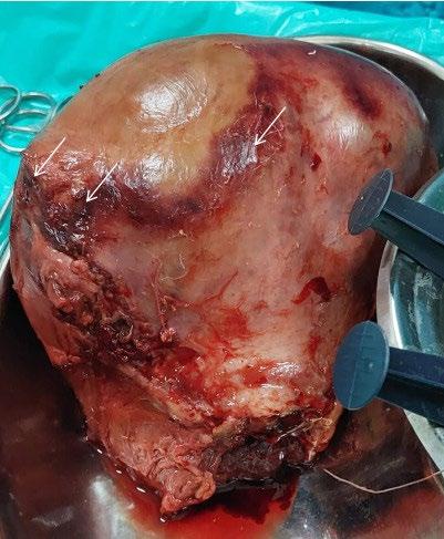 Exophytic lesion shows a central dimple or spicule at the apex of mass, as a result of traction in the gastric or bowel wall by the base of mass, thus helping to differentiate it from the extrinsic lesion.3 Findings on CT (the primary modality of choice for GIST): small GIST (<5 cm) show homogeneous enhancement and are round in morphology, while large GIST (>5 cm) are lobulated with heterogeneous enhancement, and are associated with degenerative changes, like necrosis, haemorrhage, and very rarely, calcification and metastasis as well.2,6,19,20