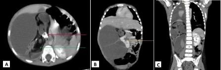 A 3-year-old girl presented with vague abdominal pain and distension for 3 weeks. She was brought to the emergency department by her parents, concerned about the enlarging abdomen. She had no gastrointestinal/urinary complaints. There was no pedal oedema or other features of fluid overload. She had no antecedent medical history or past hospital admissions. She had undergone no prior investigations regarding the complaint before visiting the authors’ hospital. Abdominal examination showed a large, palpable lump in the right lumbar region, crossing the midline (Supplementary Figure 1A). The rest of the systemic examination was normal. Blood investigations were suggestive of anaemia. The child was referred for a radiograph of the abdomen, followed by a contrast-enhanced CT scan.