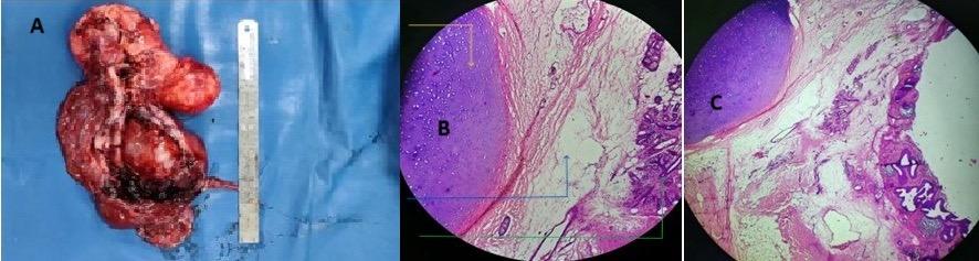 A) Gross specimen of the resected retroperitoneal lesion. B and C) Histopathology slide showing cartilaginous component (yellow arrow), glandular tissue (green arrow), and adipose tissue (blue arrow) in the resected specimen.
