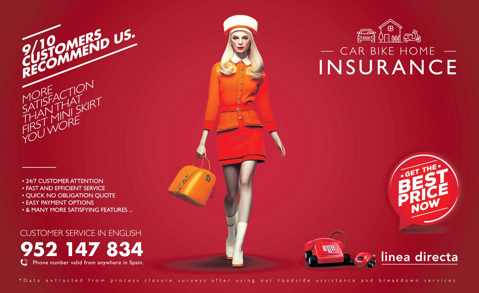 WE ARE currently the market leader in our country in the sale of direct car, motorbike, home and company fleet insurance. Since we started out in 1995, our philosophy has always been to offer an excellent service with the best prices in the market. For the most competitive quotes in English, call Linea Directa on 952 147 834. (200726)