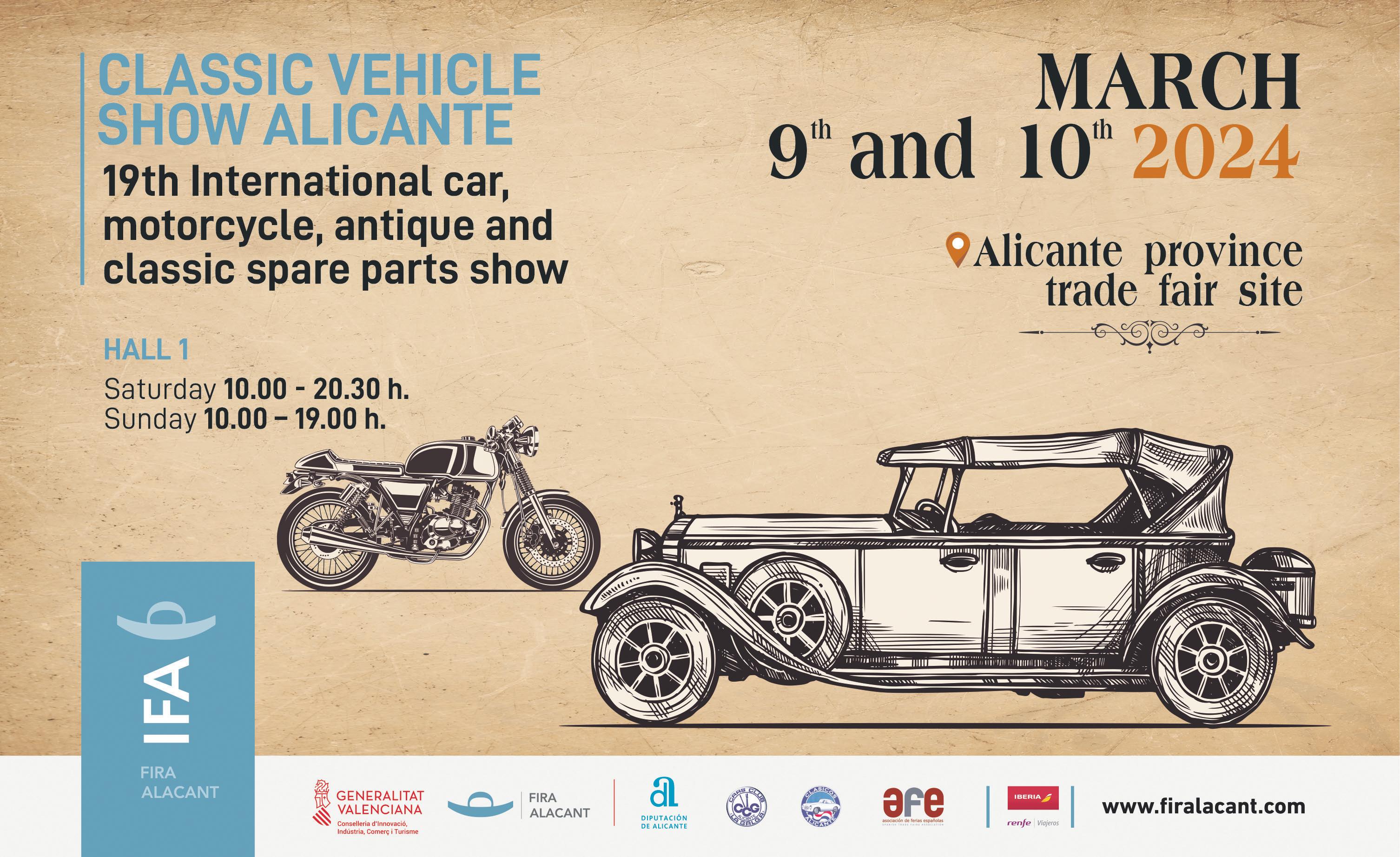 The 19th edition of ANTIC AUTO will feature an exhibition of about 80 exhibitors and over 400 vehicles. In this fair, which is supported by the ALICANTE PROVINCIAL COUNCIL, thanks to the collaboration of different clubs and private collectors, visitors will find ancient and classic vehicles and motorcycles of incalculable value, from prestigious brands such as Ferrari, Porsche, Mercedes, Jaguar, Ford, Alfa Romeo, Cadillac... and popular ones like Seat, Citroën, Renault.