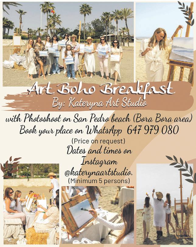C/Moncayo, 21-23, Fuengirola Tel: +34 689 471 697 with a Scandinavian touch Bring this advert for a free bottle of wine with A la carte menu Fusion info@mapuchimoda.com www.mapuchimoda.com Mon-Fri 10.00 - 5.30- Wed Closed Sat 10 - 2 Boulevard de la Cala, Edif B, Local 11, La Cala de Mijas 29649 Bringing out the bestinyou! Tel: 951 156 870 OUR SPRING SUMMER 2024 COLLECTION INCLUDES ROBELL, MALISSA J, CFK, HELEN BELLART PLUS LOTS MORE. Ladies fashion boutique and fashion shows 952 801 645 Restaurante Playa Bella Mejor restaurante mediterraneo de Estepona MEJOR .ES Restaurant Playa Bella Thank you for letting us be part of your family