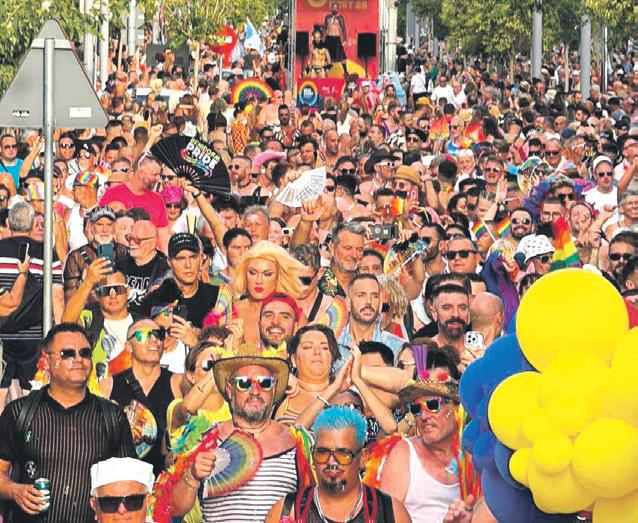 THE vibrant and energetic Benidorm Pride parade brought together thousands of individuals from diverse backgrounds to celebrate and show support for the LGBTQIA+ community. The parade featured a spectacular display of colours, with not only rainbow ags but also an array of dazzling costumes and spirited dancers, creating a lively and inclusive atmosphere that took over the streets of Benidorm.