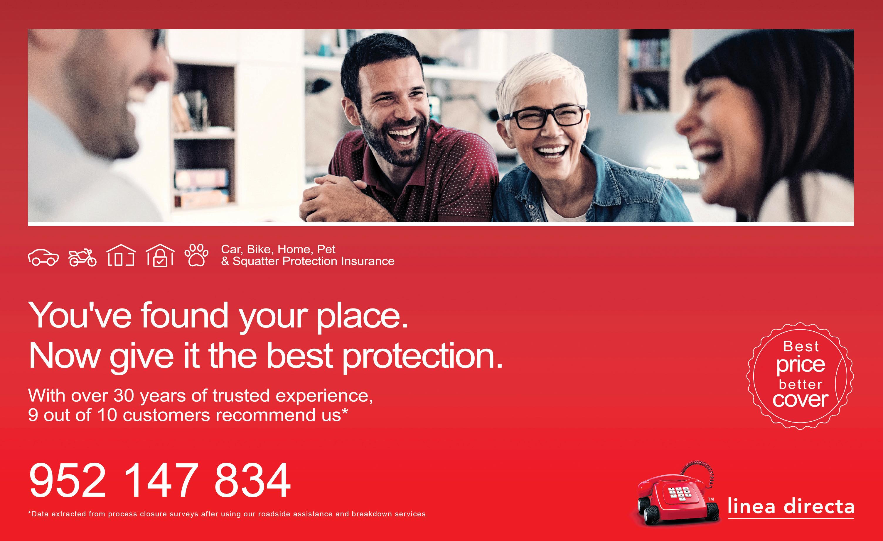 WE ARE currently the market leader in our country in the sale of direct car, motorbike, home and company fleet insurance. Since we started out in 1995, our philosophy has always been to offer an excellent service with the best prices in the market. For the most competitive quotes in English, call Linea Directa on 952 147 834. (200726) OTHERS