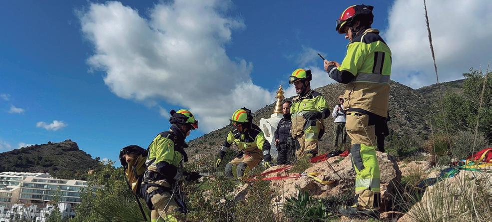 Witnesses watched as the dog became trapped on a precarious ledge, unable to climb back to safety. The Benalmadena Fire Service arrived within minutes, deploying a specialist team trained in technical high-angle rescues.