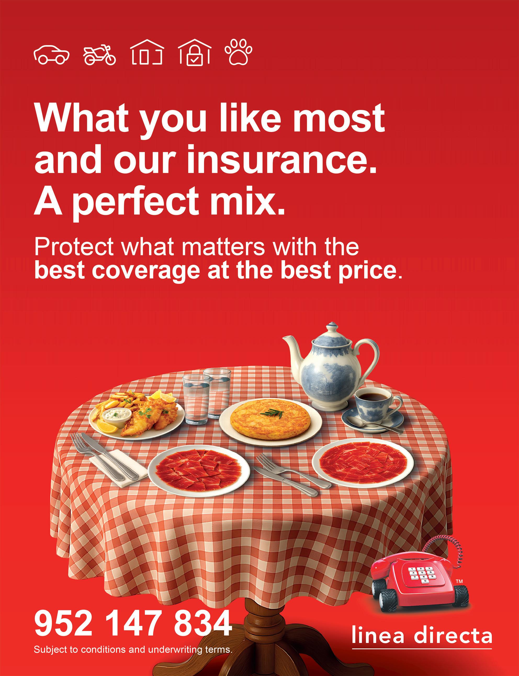 WE ARE currently the market leader in our country in the sale of direct car, motorbike, home and company fleet insurance. Since we started out in 1995, our philosophy has always been to offer an excellent service with the best prices in the market. For the most competitive quotes in English, call Linea Directa on 952 147 834. (200726)
