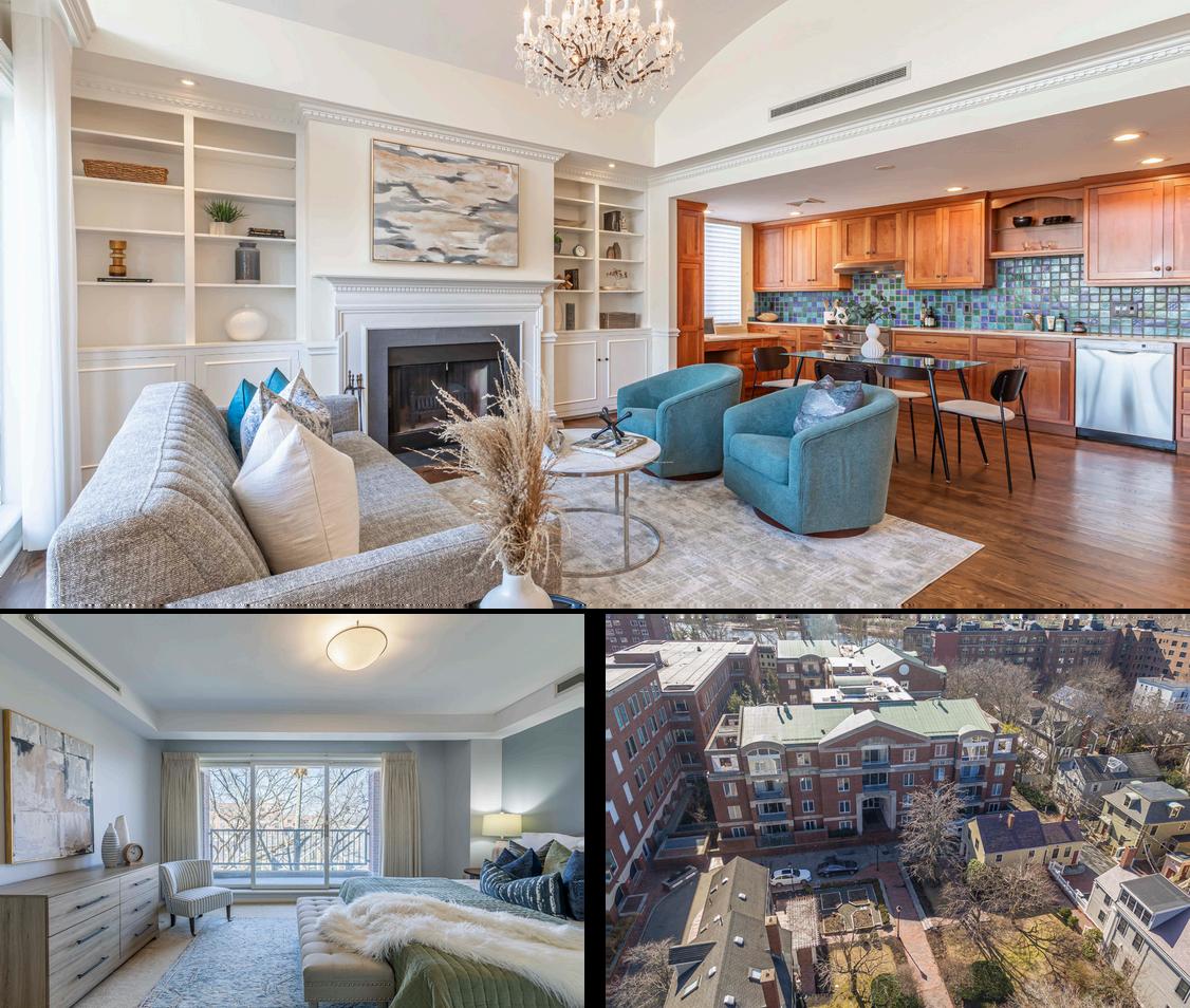 Rarely are homes offered for sale at the full service Luxury University Green! Discover this flexible 3-bed, 3-bath, 3 patio, 1720 sq ft trophy penthouse duplex condo at the edge of Harvard Square. Occupying the top two floors with elevators at both levels. Open Living area with den has a patio and fireplace. Meticulously upgraded throughout with open living space enhanced by the soaring barrel-vaulted ceiling and an attic easement offering additional space This fine residence enjoys rich mahogany stained oak hardwood floors & crown molding on the 5th floor The generous main bedroom offers ensuite bath and a private patio. 1 Garage parking space.