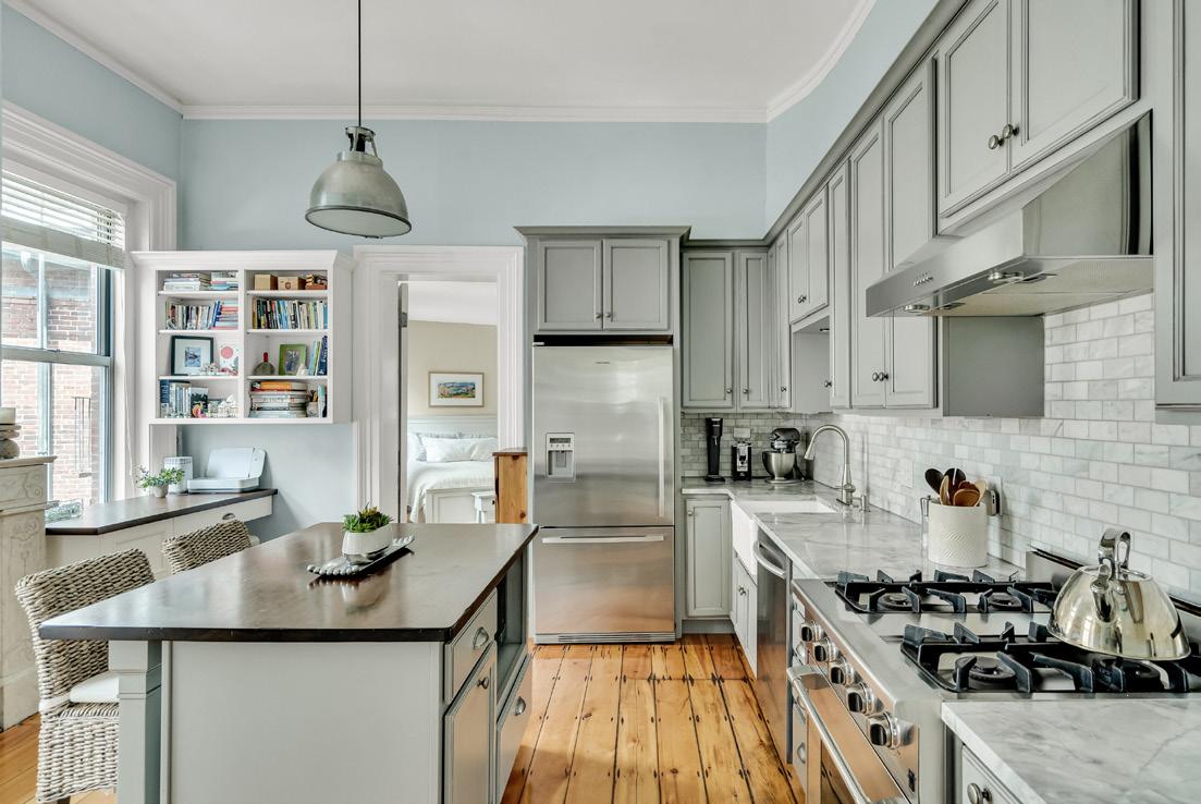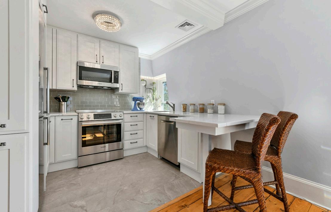 From the substantial crown molding down to the lovely wide pine flooring, this home oozes comfort. You’ll find a fireplace tucked into the corner of the living room. The smartly designed 2019 kitchen renovation spared no expense, starting with the floor to ceiling custom cabinetry, quartz counters and Bosch stainless steel appliances. The bathroom is a sanctuary – it is spacious and boasts upgraded cabinetry, timeless tile choices, designer lighting and soaking tub. This home features 2019 central air conditioning, accent lighting throughout, in-unit Bosch washer and dryer (vented!). The large back yard is common space shared with only two other units.