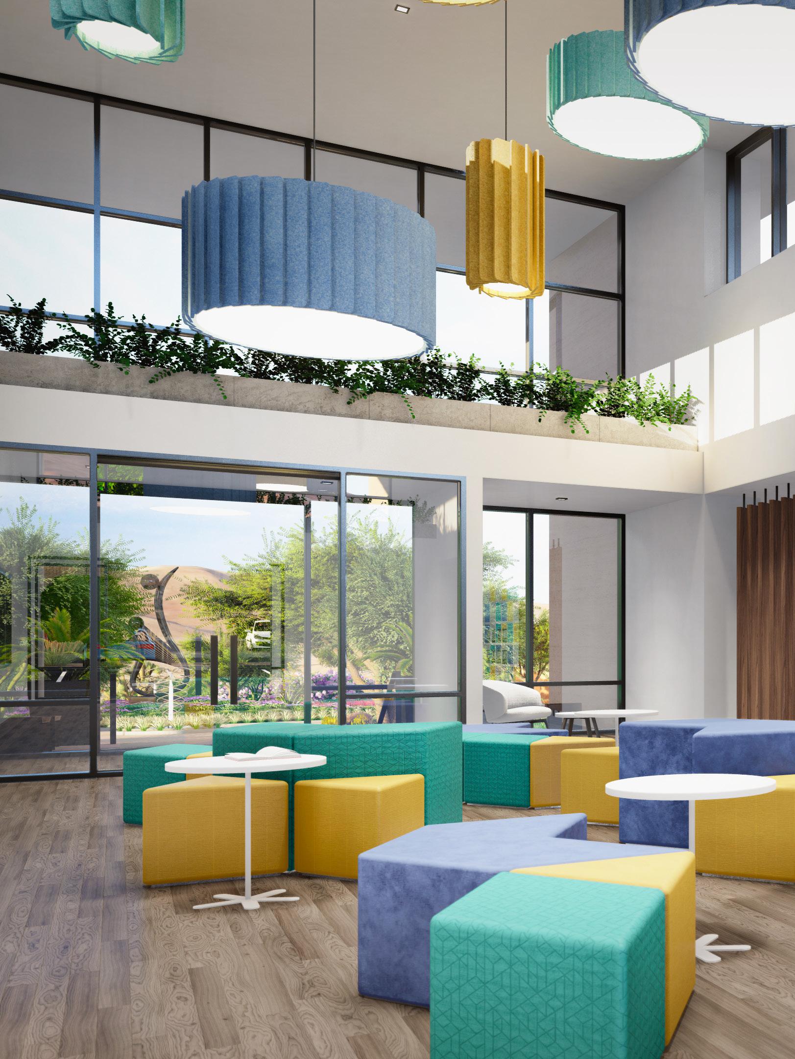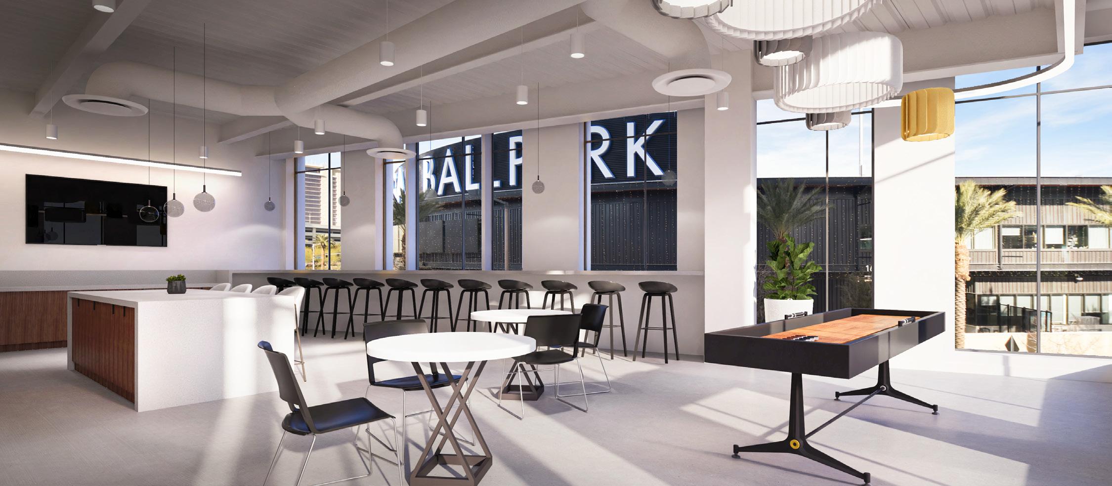 Conceived as a contemporary fusion of form and function, the clubhouse offers an elevated palette of amenities more akin to a boutique resort than a conventional apartment complex. At its heart is a sleek, café-style coffee bar that flows seamlessly into a high-performance fitness and cardio suite, while adjacent zones include a tech-enabled clubroom and lounge, a vibrant game room, and smart package lockers designed to accommodate e-commerce deliveries with ease. Expansive glazing frames views of the adjacent pool deck, where a fire-pit lounge invites residents to gather under the desert sky.