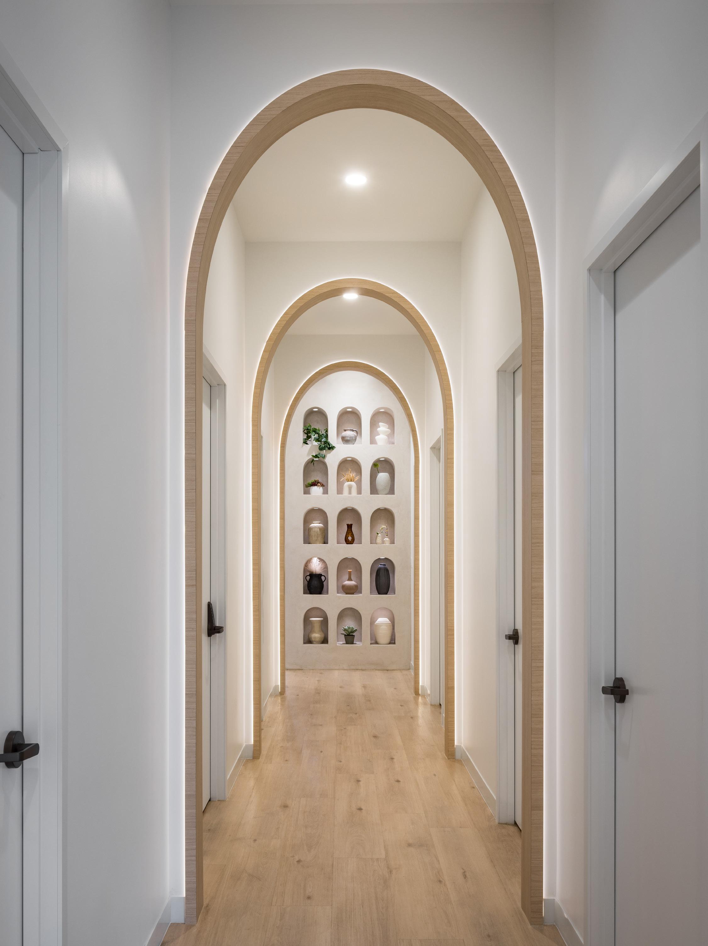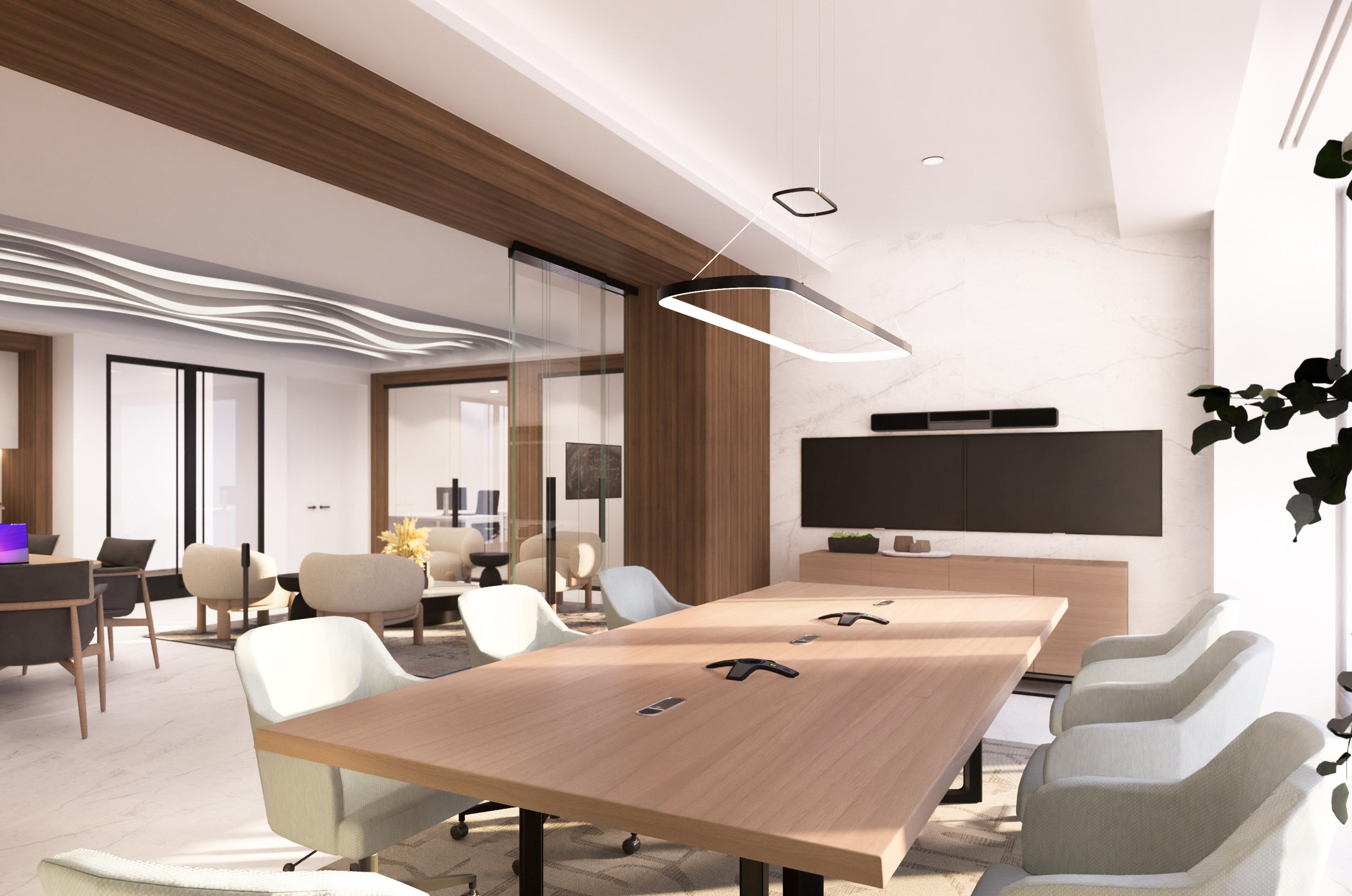 The interior architecture is anchored by a restrained palette of soft grays, punctuated with carefully curated bursts of color that lend energy without overwhelming the space. Rich walnut detailing lends warmth and refinement to custom millwork, wall treatments, and ceiling installations, unifying the interiors through a subtle material language. The thoughtful modulation of ceiling heights, combined with integrated lighting, elegantly guides visitors through a space designed for both flow and discovery.