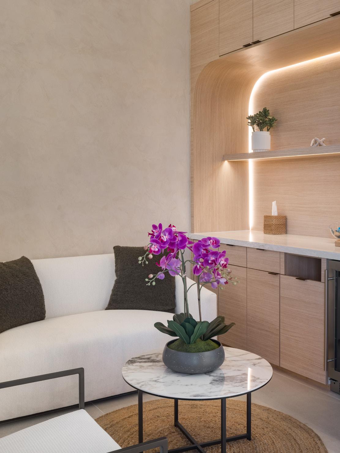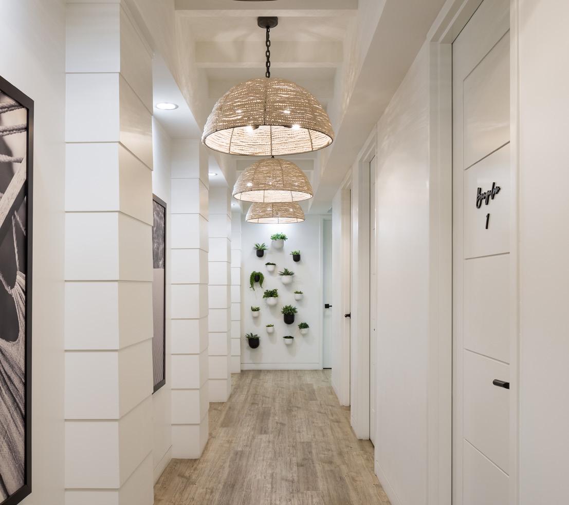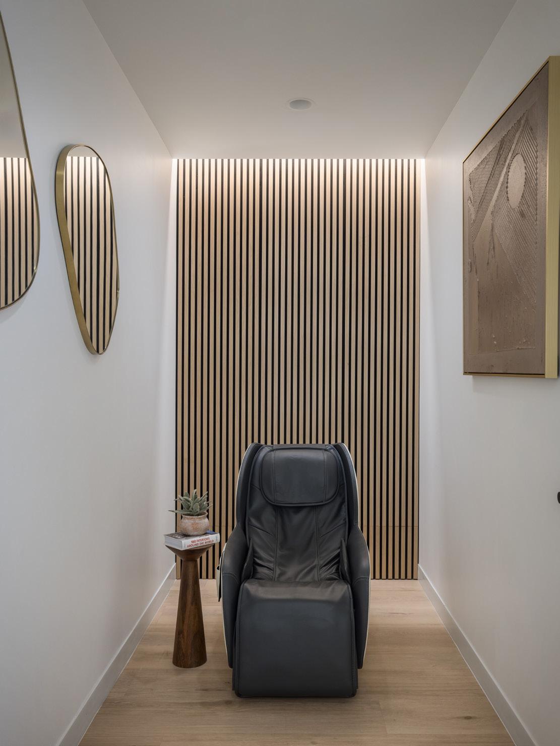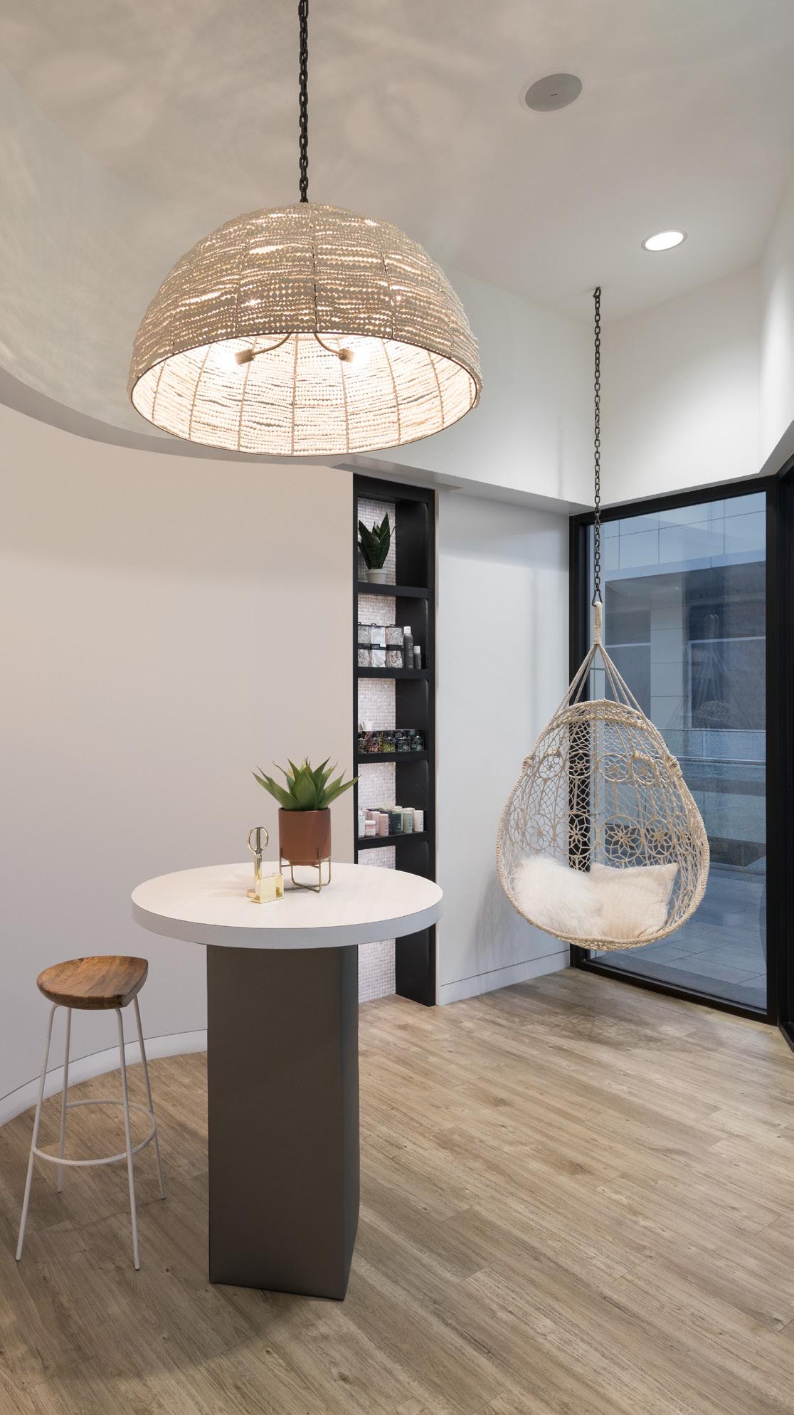 The design unfolds in a palette of crisp white walls, breezy shiplap paneling, and sun-warmed wood tones that conjure the ease of a seaside afternoon. Far from the typical aesthetics associated with tanning salons, the interior reads more like a high-end lifestyle boutique—bright, calming, and meticulously composed. Each element, from the hardware finishes to the custom millwork, was selected to embody the brand’s identity: elevated, approachable, and effortlessly chic.