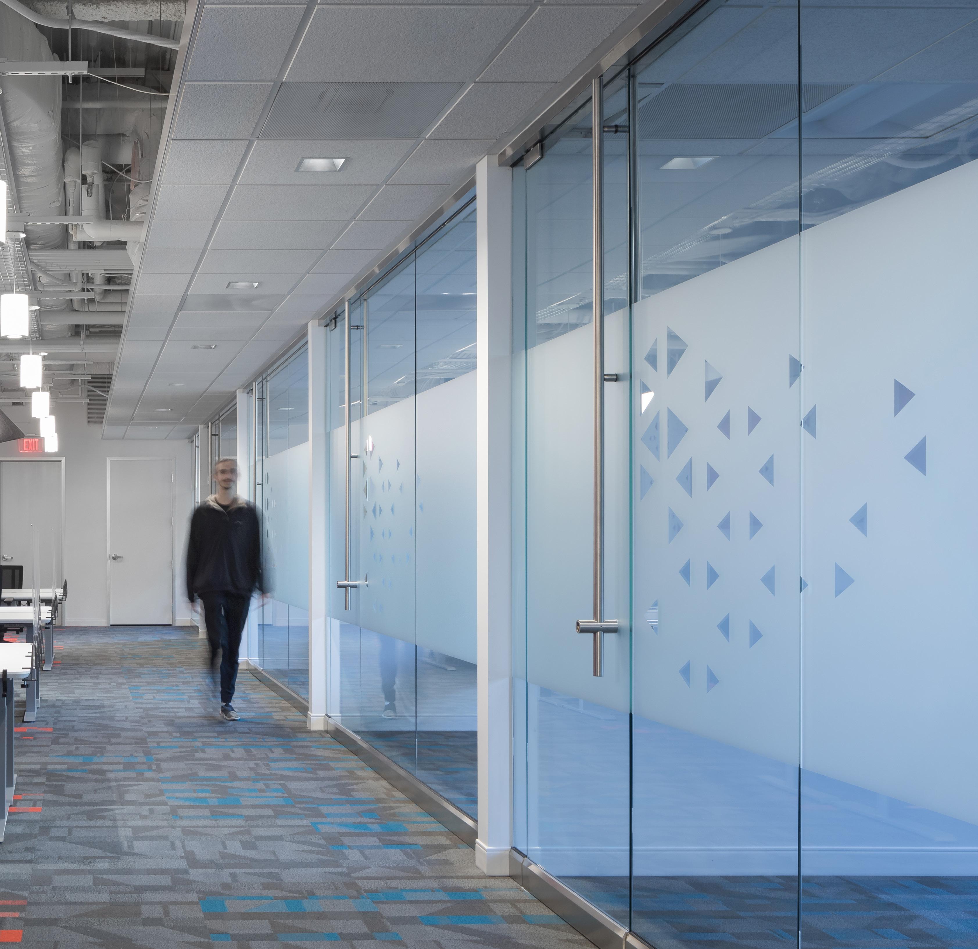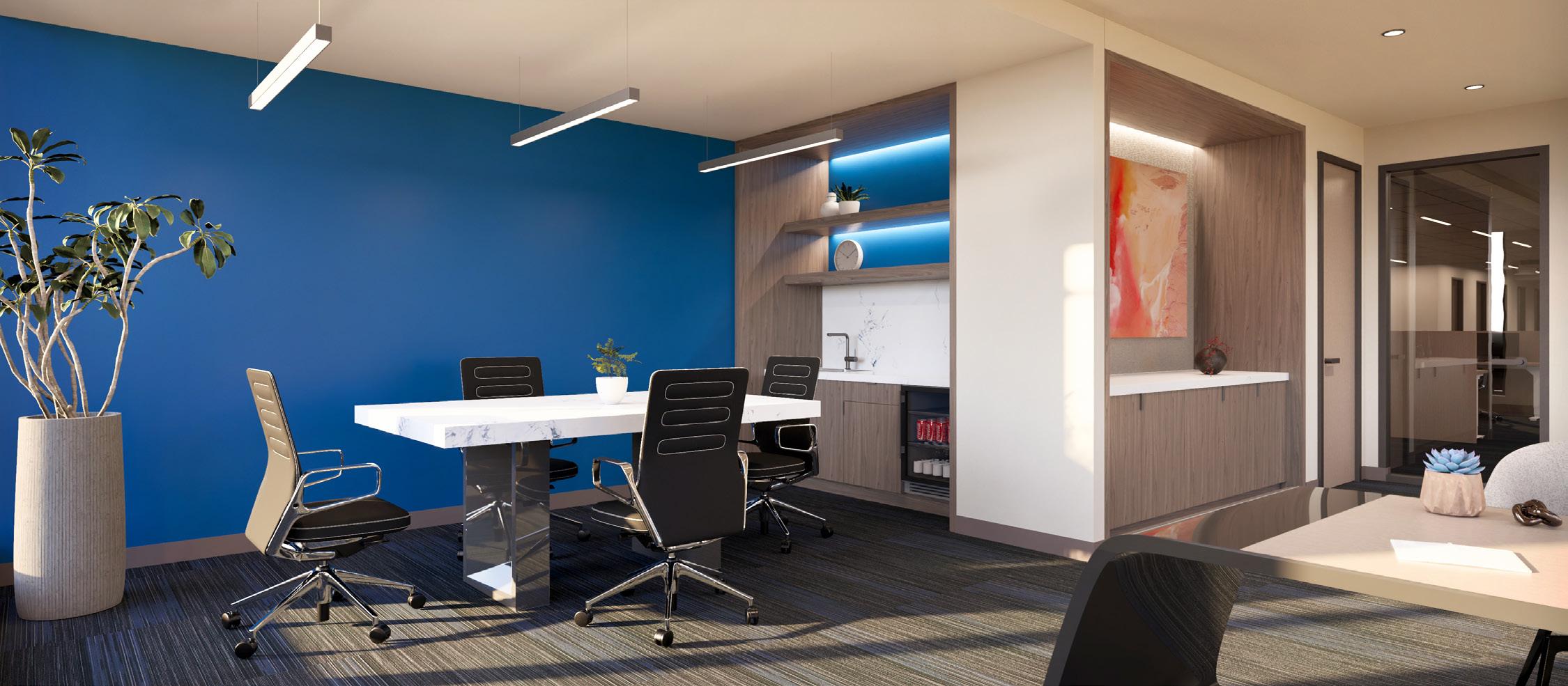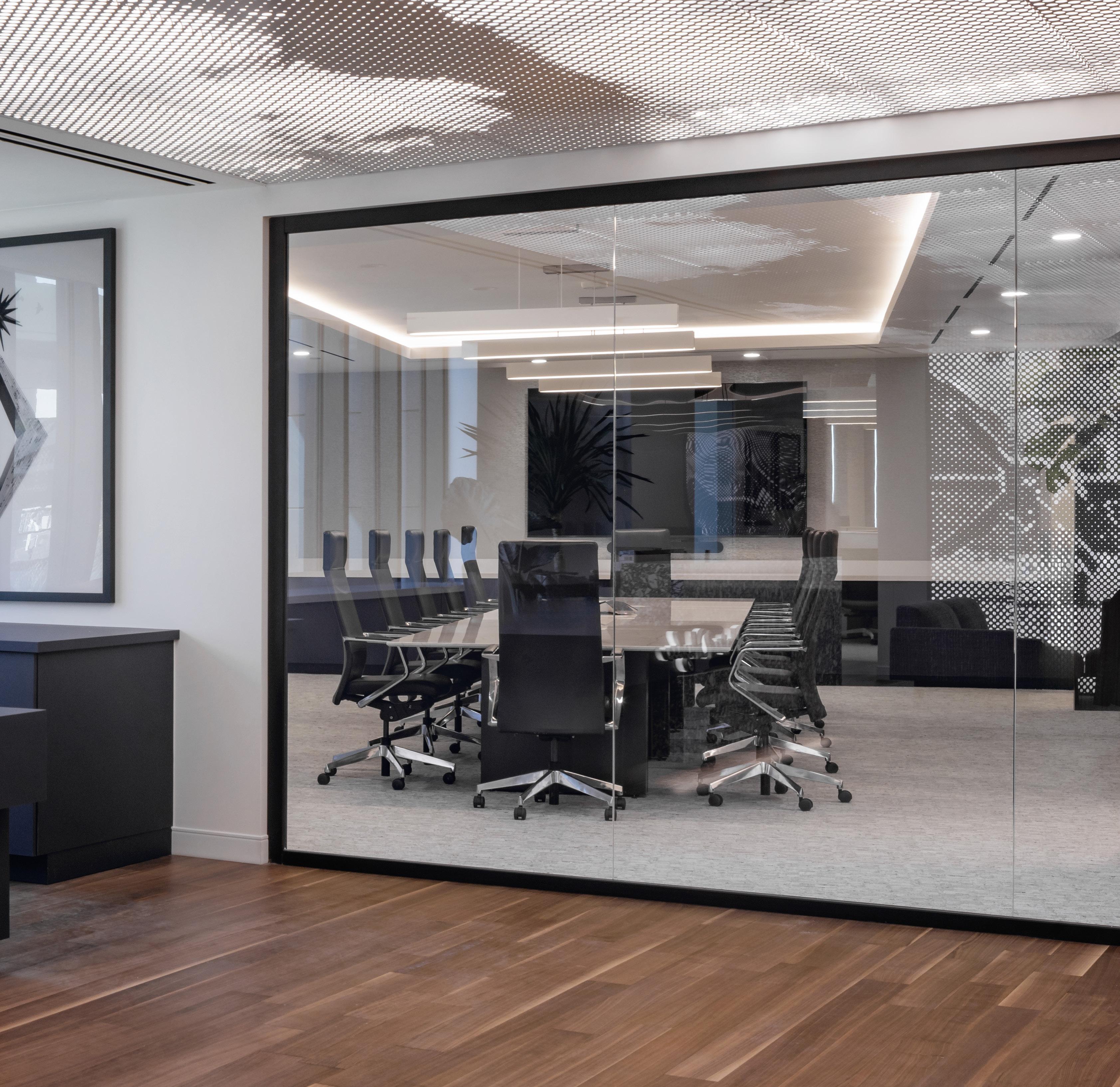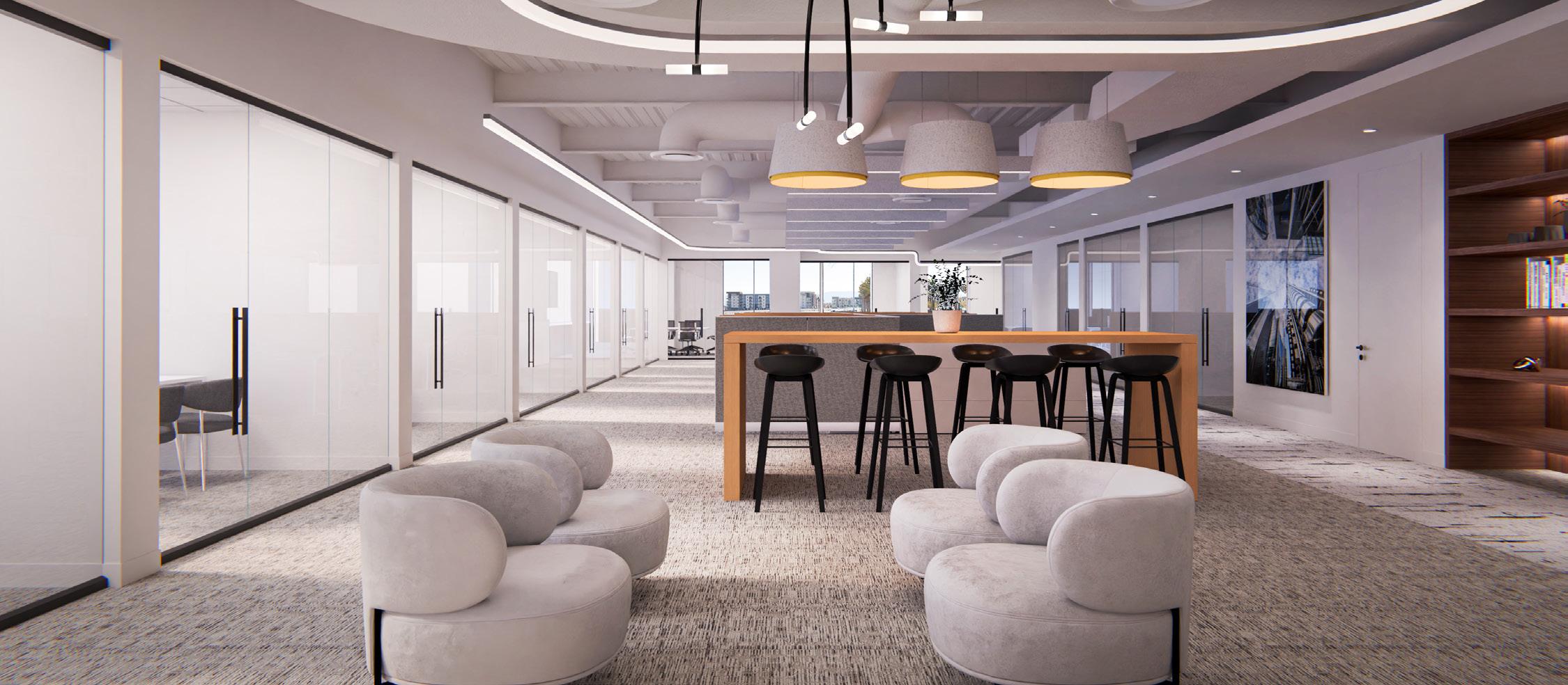 Work zones are articulated with tonal contrast—deep, saturated hues and layered textures define shared lounges and meeting areas, while carpet tile and stone demarcate circulation and collaborative nodes. Private offices reinforce a culture of accessibility through full-height glass partitions and sliding barn doors, fostering transparency and inclusivity throughout the workplace. The result is a refined, thoughtfully tailored environment that reflects the client’s commitment to excellence, clarity, and a modern workplace ethos.
