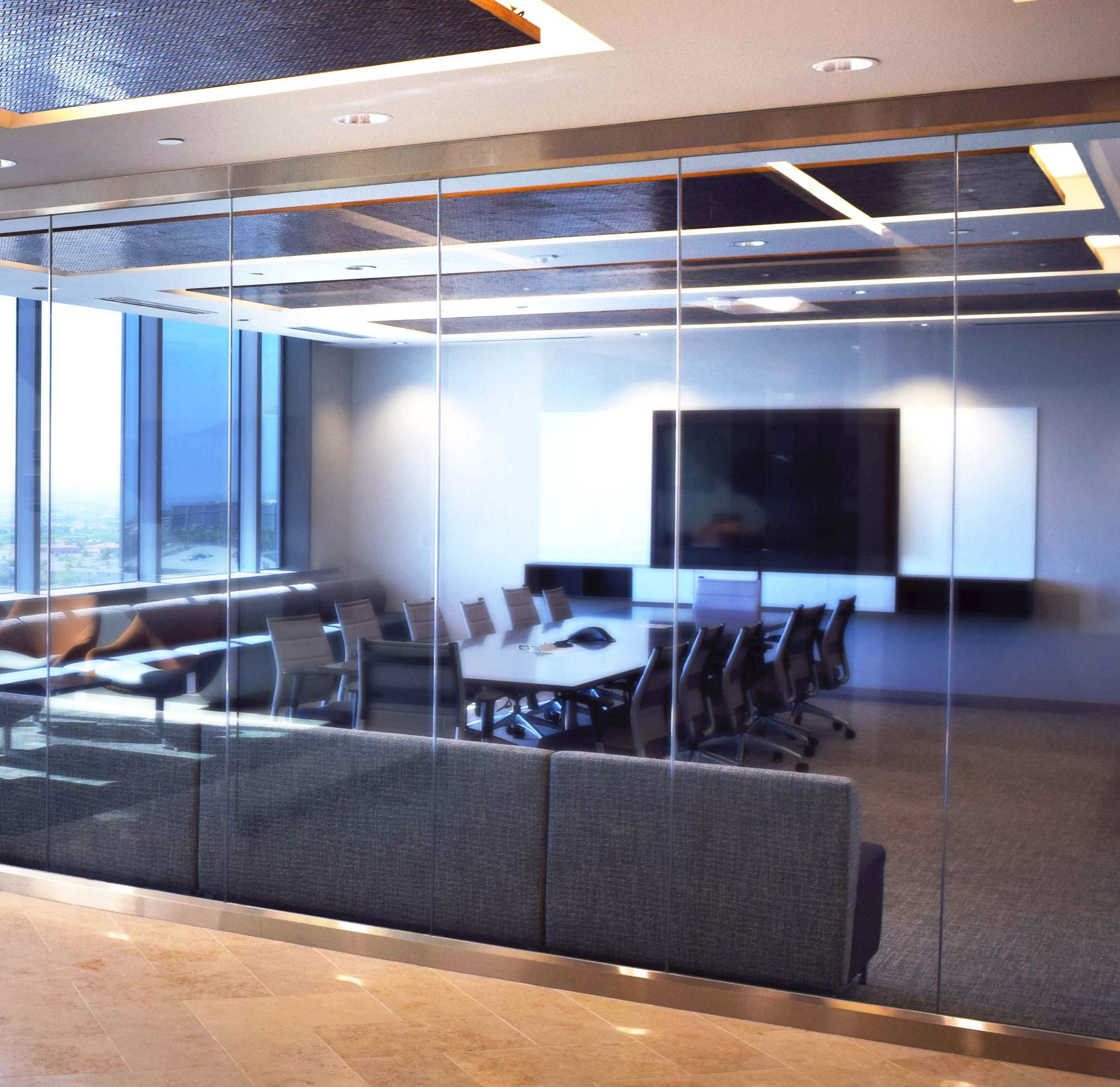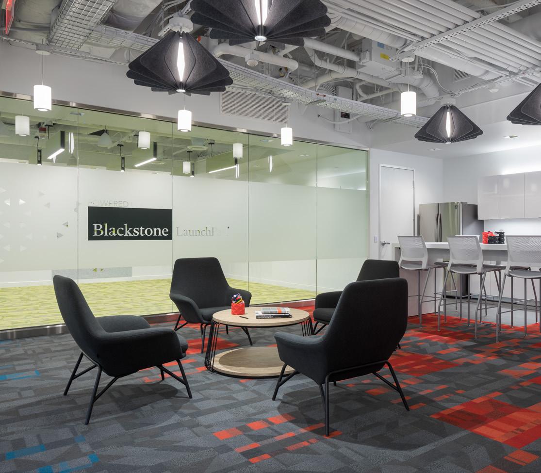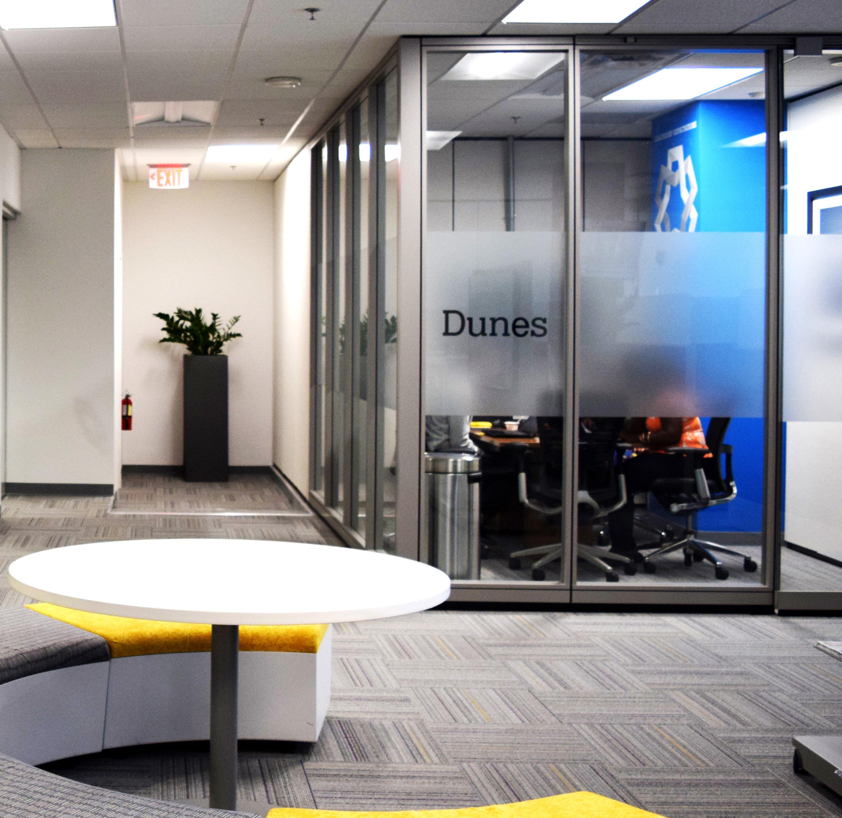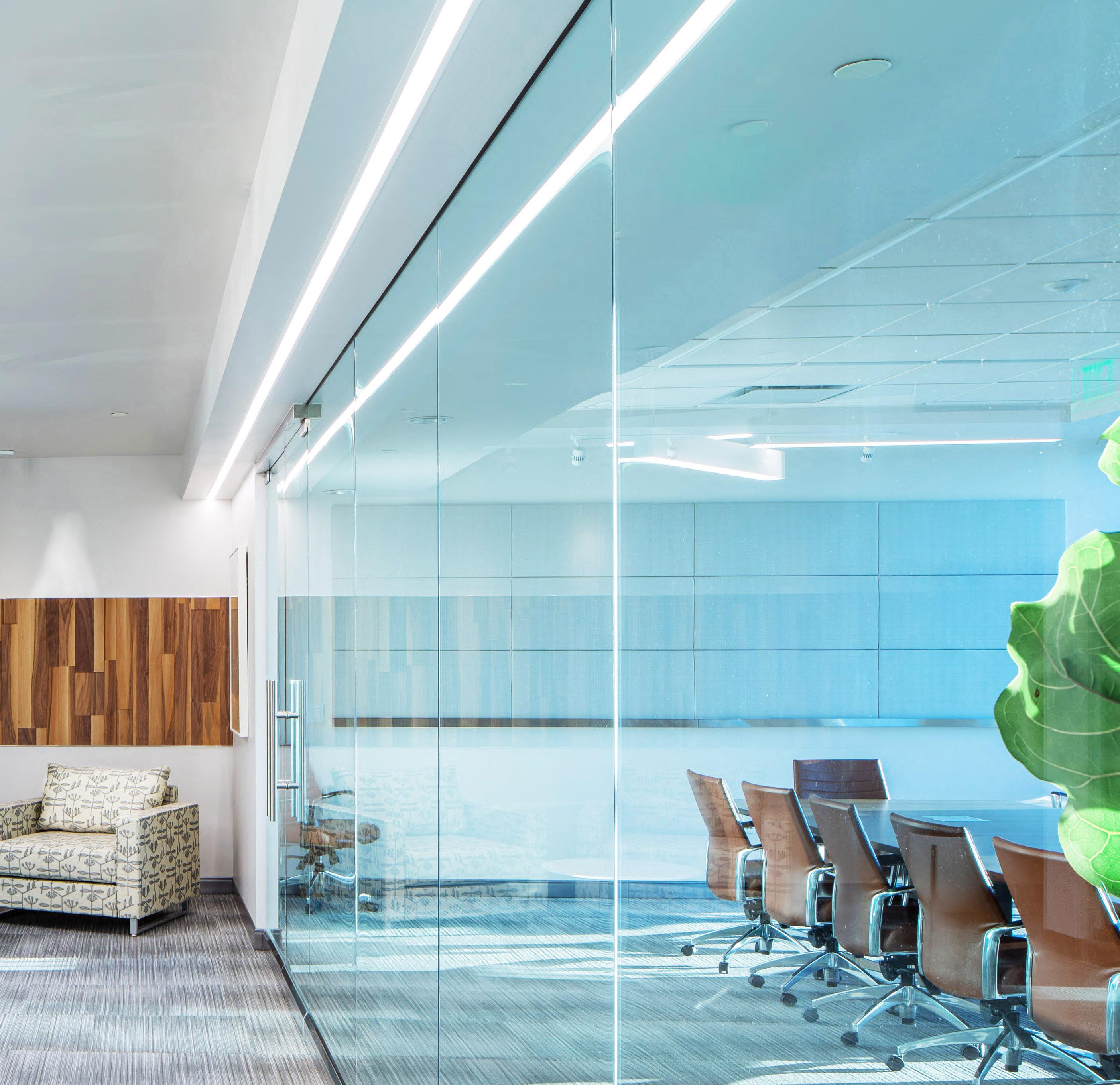 Work zones are articulated with tonal contrast—deep, saturated hues and layered textures define shared lounges and meeting areas, while carpet tile and stone demarcate circulation and collaborative nodes. Private offices reinforce a culture of accessibility through full-height glass partitions and sliding barn doors, fostering transparency and inclusivity throughout the workplace. The result is a refined, thoughtfully tailored environment that reflects the client’s commitment to excellence, clarity, and a modern workplace ethos.