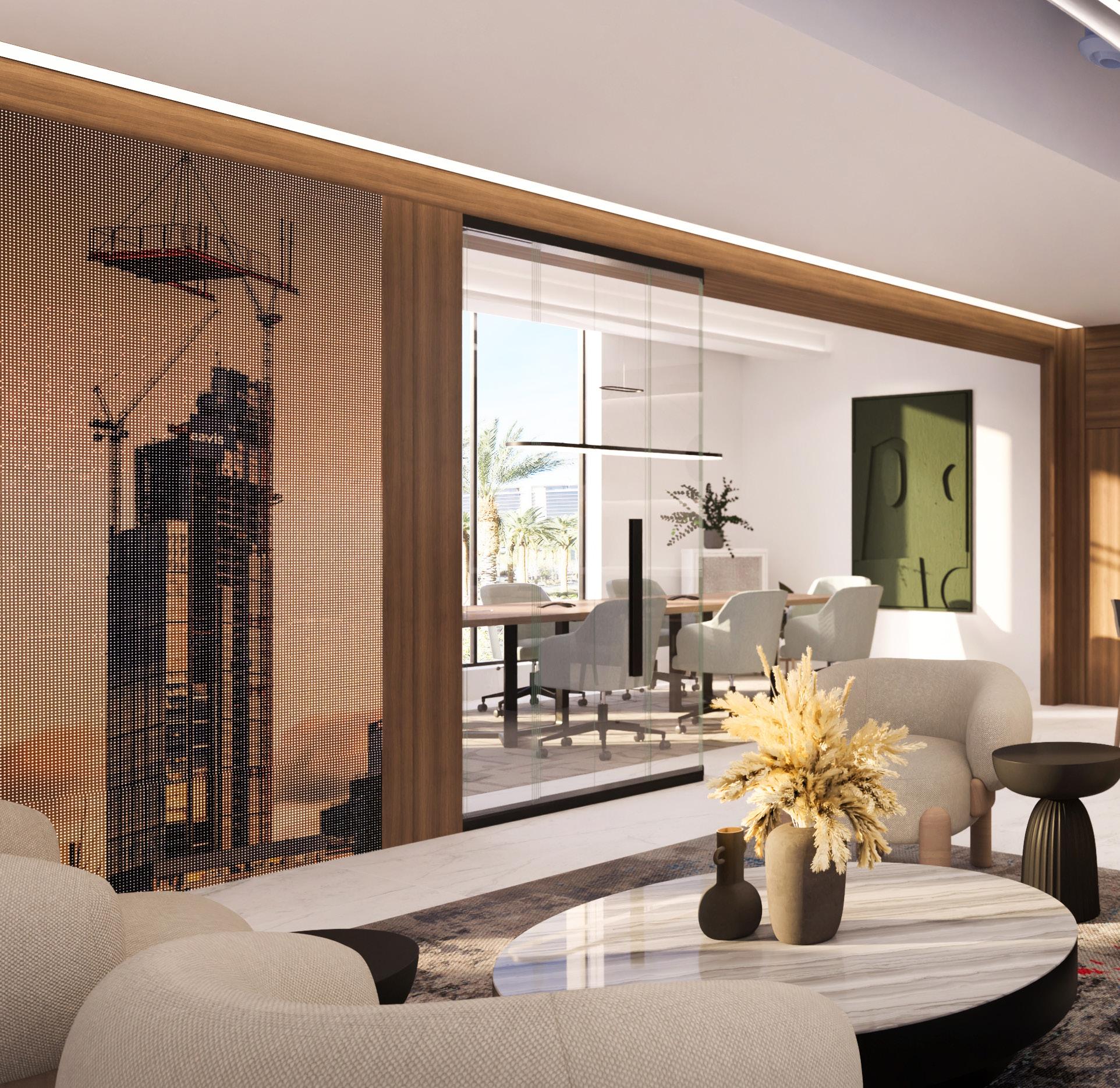 Upon entry, visitors are welcomed into a spacious, hospitality-inflected living room that sets the tone for the office’s open, inviting character. From here, sightlines extend into a glass-enclosed main conference room and an adjacent showroom that features a curated display of the firm’s latest gaming innovations—transforming the front-of-house experience into a brand statement.