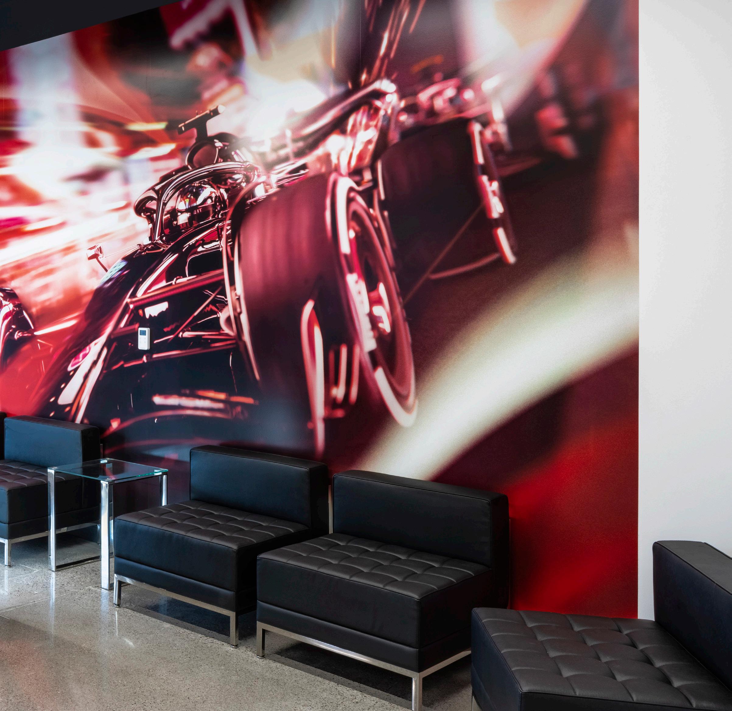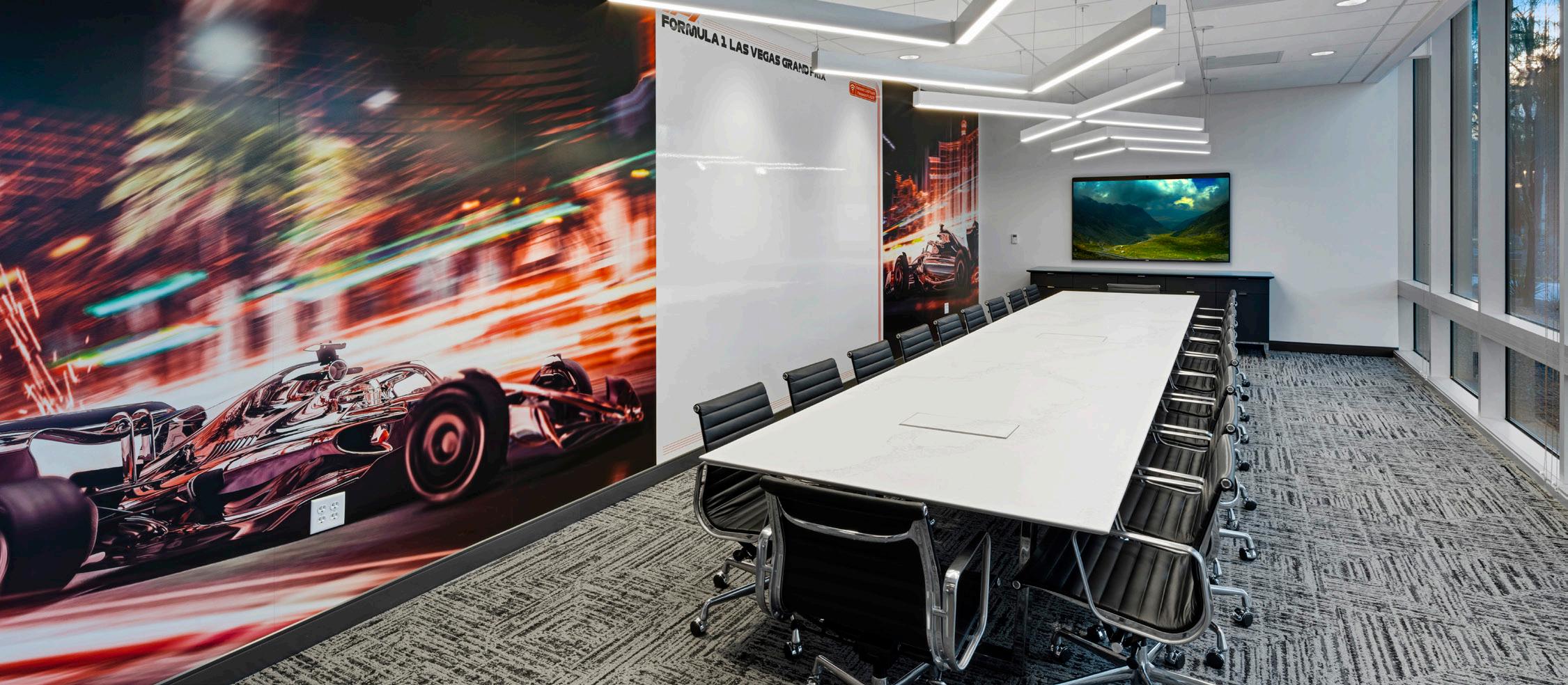 Harnessing the visual language of the racing world, EV&A employed larger-than-life environmental graphics as immersive wall treatments, transforming corridors and gathering zones into branded experiences. Iconic imagery and design motifs drawn directly from motorsports animate the arrival sequence, framing the entrance lobby, conferencing suite, and staff lounge with kinetic energy. These design moves not only celebrate the company’s identity but also anchor the spatial narrative in momentum and performance.