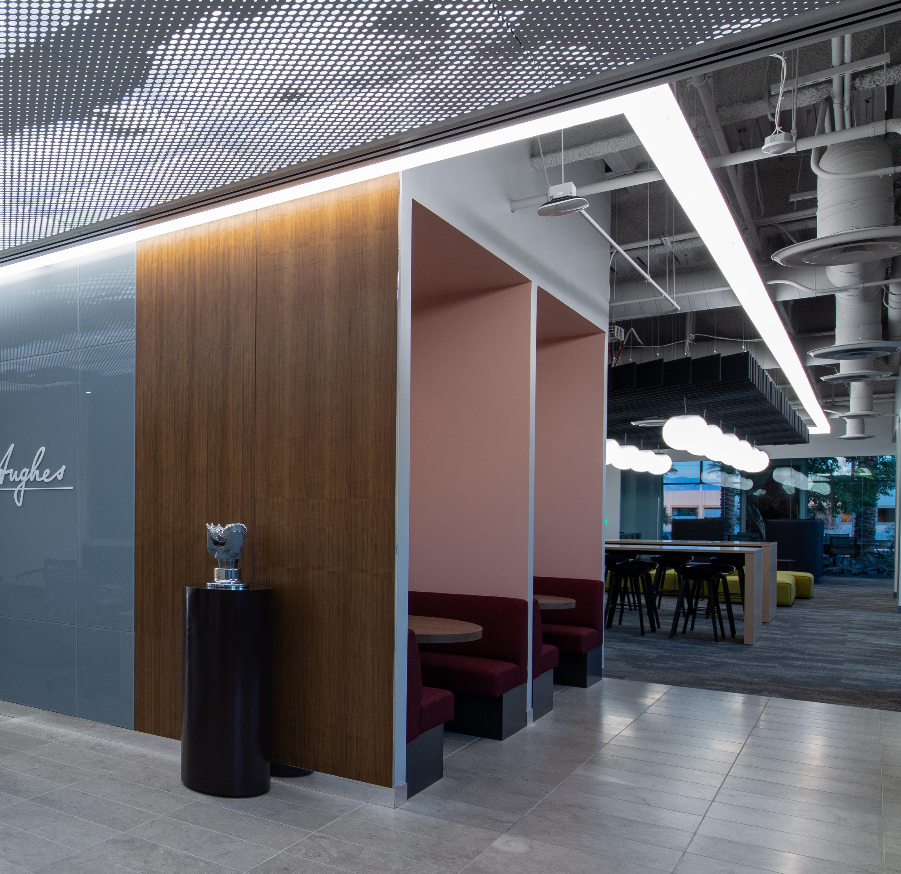 The design team employed an exposed ceiling strategy to enhance spatial volume and foster visual continuity across zones, while selective soffiting and an advanced specialty lighting system delineate key functional areas with subtlety and clarity. In support of the company’s technical operations, the floor plan also incorporates private workstations for engineering teams and a purpose-built, acoustically optimized sound booth—a bespoke environment where original soundscapes and musical content are produced to elevate the immersive quality of next-generation gaming machines. Altogether, the project exemplifies how high-performance workplace design can be finely attuned to the demands of a rapidly evolving entertainment technology sector.