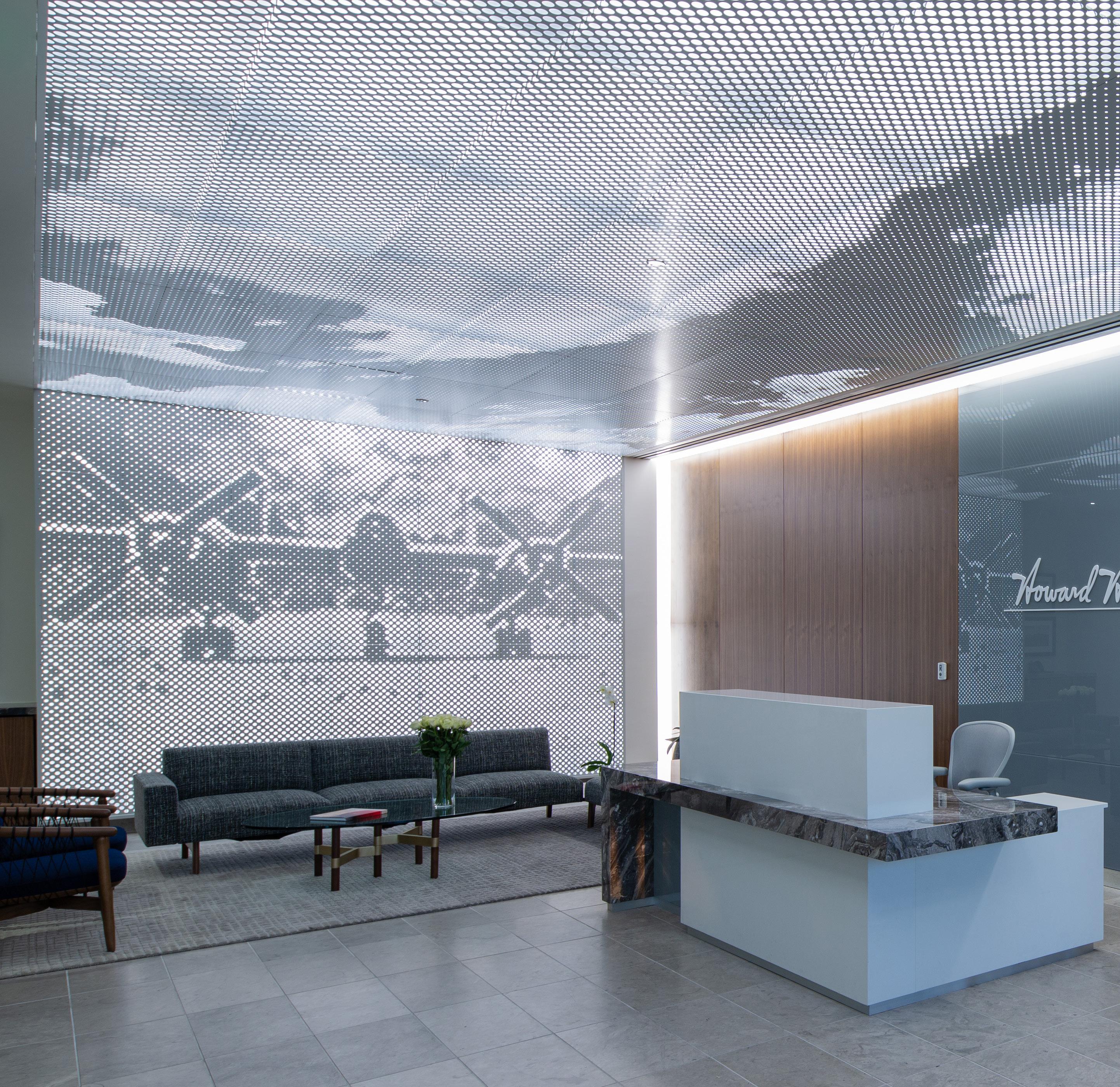Departing from conventional front-of-house arrangements, the reception desk is subtly offset, allowing visitors to take in the full breadth of exterior views upon arrival. The entry sequence unfolds beneath a meticulously detailed ceiling, where hard lid elements are punctuated with herringbone-patterned walnut inlays, adding warmth and material richness overhead. Beneath, polished stone flooring in subdued tones anchors the palette with a crisp, contemporary sensibility.