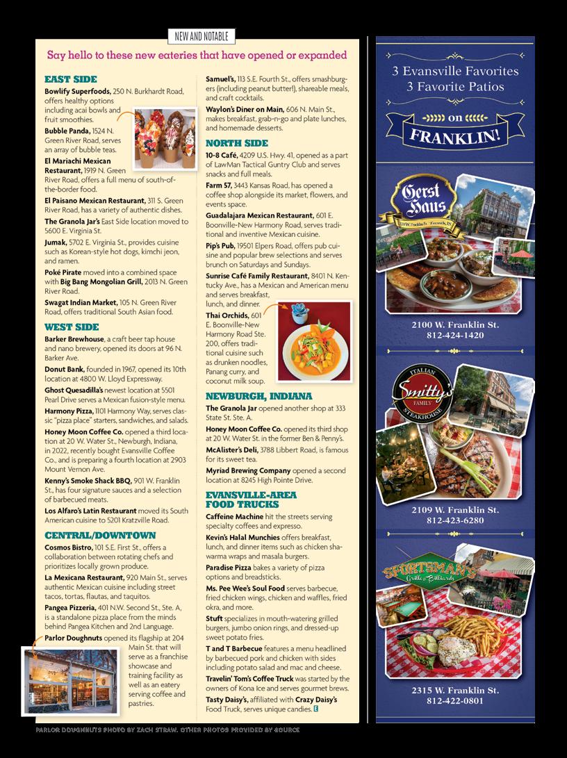 Dive in and discover resources and guides to make the most of your shopping and dining experiences here. Play at our many recreation facilities and explore our broad cultural sites. Stay on top of the latest happenings and developments around town. Test your Evansville trivia on facts, popular and obscure, and then celebrate all the ways our city is unique in our feature story, “The ABCs of Evansville” (page 44).
