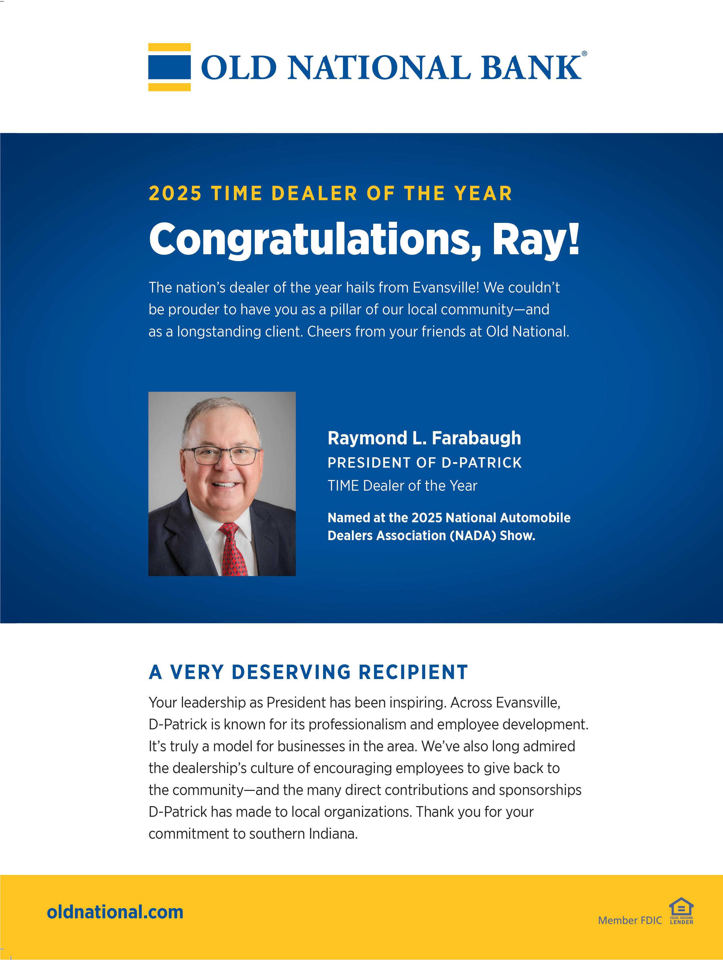 Ray Farabaugh, copresident of D-Patrick Automotive Group who is featured on the cover of this issue, won TIME’s Dealer of the Year award at the 2025 National Automobile Dealers Association Show in January. What an incredible, welldeserved honor. Congratulations, Ray. Read more about Ray, D-Patrick, and the regional automotive sales industry in the feature story on page 30.