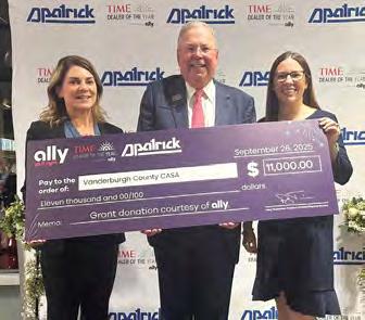 D-Patrick Automotive Group donated $11,000 to Vanderburgh County CASA during a Sept. 25 event hosted by Ally Financial in honor of D-Patrick CoPresident Ray Farabaugh, recipient of the 2025 TIME Dealer of the Year award.