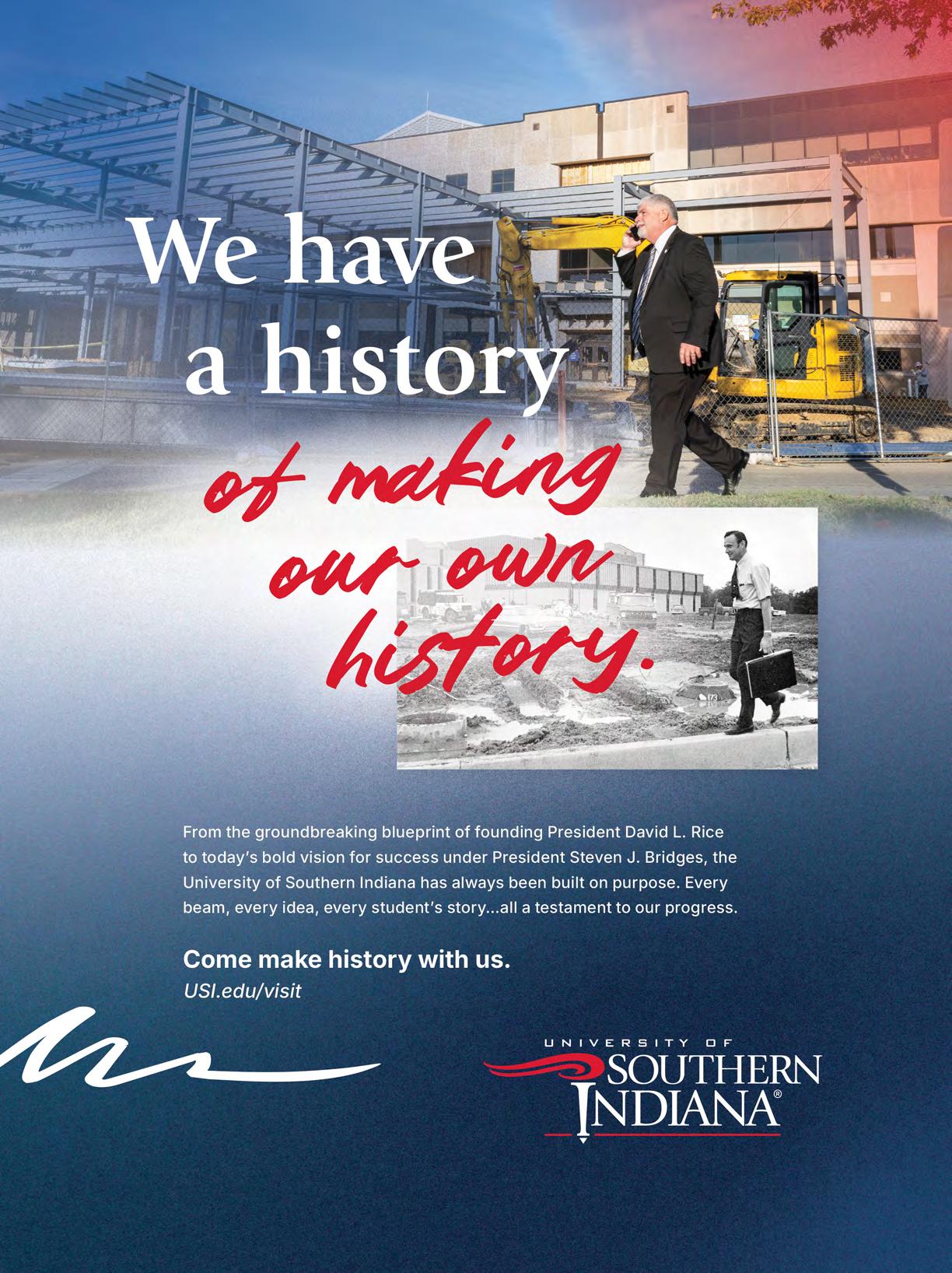 On the cover is the new University of Southern Indiana president, Steven “Steve” Bridges. He is universally liked; I have heard compliments such as “terrific choice,” “down to earth,” “man of the people,” and “just a regular guy who succeeded.” He’s not an academic but a businessman who rose all the way up to become president of his alma mater. Congratulations to you, Steve.