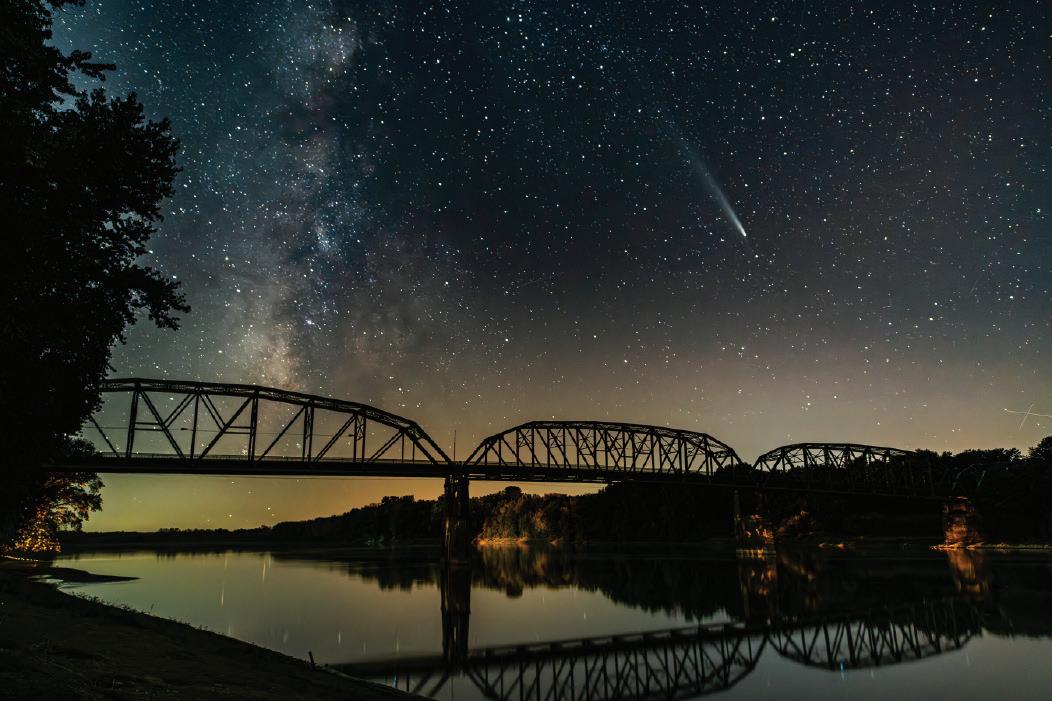 1. The Harmonist Labyrinth in New Harmony, Indiana, dates to the 19th Century and was reconstructed to its original form in 2008. 2. Evansville’s Old Vanderburgh County Courthouse was built in the late 1880s in the Beaux Arts style. 3. A beachy island springs up near Downtown Evansville late each summer when the U.S. Army Corps of Engineers dredges the Ohio River. 4. Howell Wetlands is one of only five urban wetland parks in Indiana. 5. A comet soars above the closed Harmony Way Bridge on the Wabash River in New Harmony. 6. Rural Saint Wendel straddles the Vanderburgh-Posey County line and is named for the village’s Catholic parish. 7. Olmsted Administration Hall has stood watch over the University of Evansville’s campus since 1922. 8. Fireworks in Newburgh, Indiana, are set against a backdrop of the Newburgh Locks and Dam and Alcoa and Kaiser Aluminum manufacturing sites. 9. Evansville’s Four Freedoms Monument was dedicated in 1976 during the U.S. bicentennial. The 26-foot limestone columns once decorated the C&EI Railway Depot. 10. The Caborn Chapel near Mount Vernon, Indiana, dots farmland vistas.