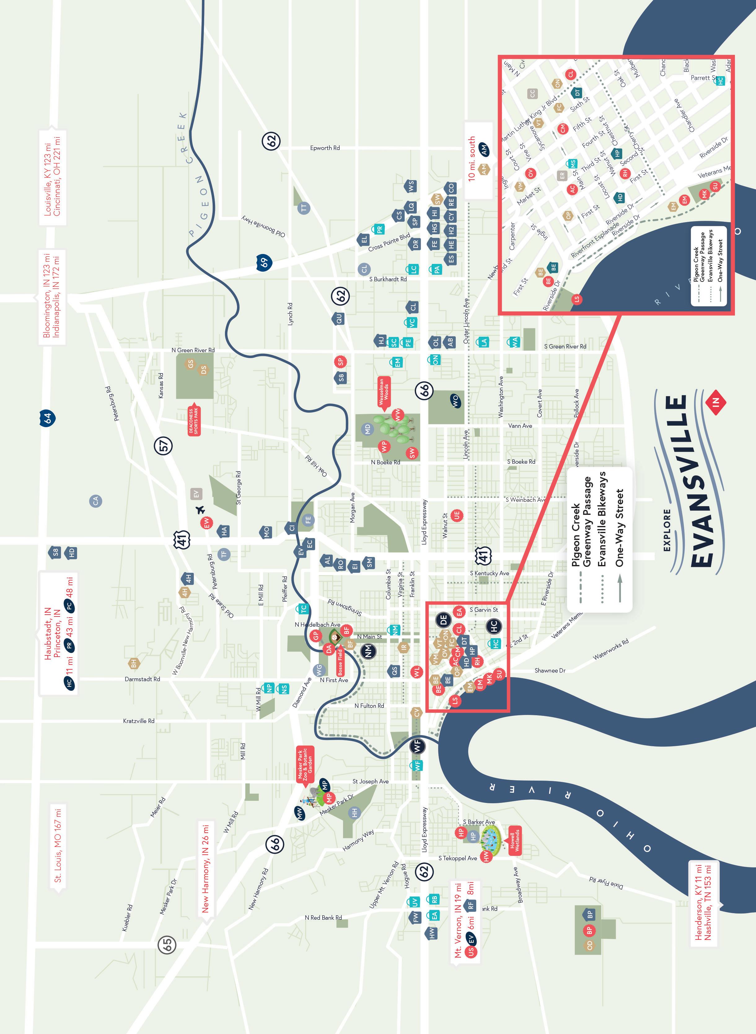 Explore Evansville (Evansville Convention & Visitors Bureau) 20 N.W. Third St., Ste. 410 800-433-3025 exploreevansville.com