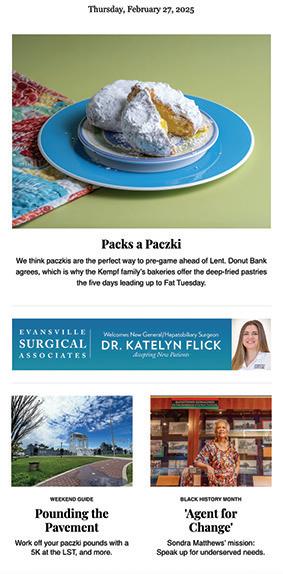 facebook.com/evansvilleliving • x.com/evansville linkedin.com/company/tucker-publishing-group Instagram @evansvilleliving evansvilleliving.com evansvilleliving.com/e-newsletter