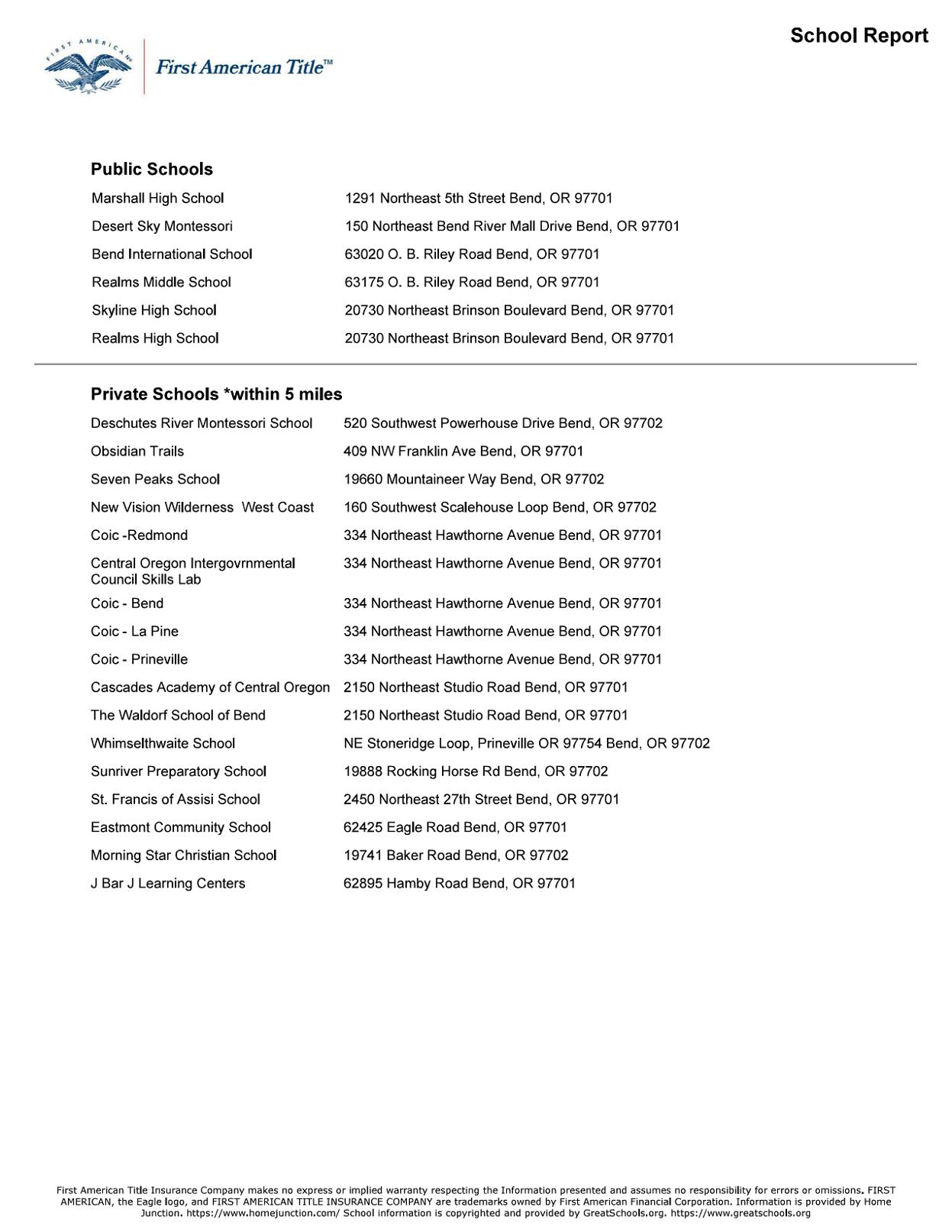The information and maps presented in this report are provided for your convenience. Every reasonable effort has been made to assure the accuracy of the data and associated maps. Deschutes County makes no warranty, representation or guarantee as to the content, sequence, accuracy, timeliness or completeness of any of the data provided herein. Deschutes County explicitly disclaims any representations and warranties, including, without limitation, the implied warranties of merchantability and fitness for a particular purpose. Deschutes County shall assume no liability for any errors, omissions, or inaccuracies in the information provided regardless of how caused. Deschutes County assumes no liability for any decisions made or actions taken or not taken by the user of this information or data furnished hereunder.