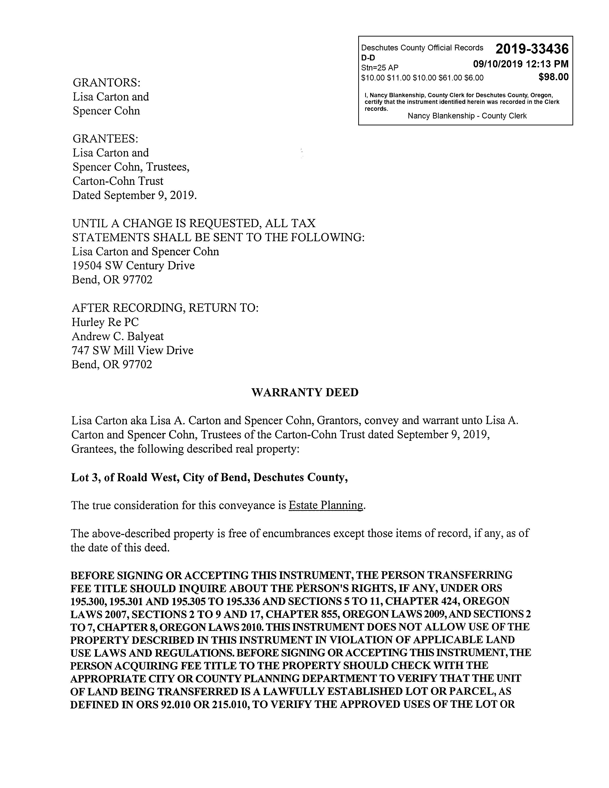 CARTON-COHN TRUST CARTON, LISA A & COHN, SPENCER TTEES 19504 SW CENTURY DR BEND OR 97702