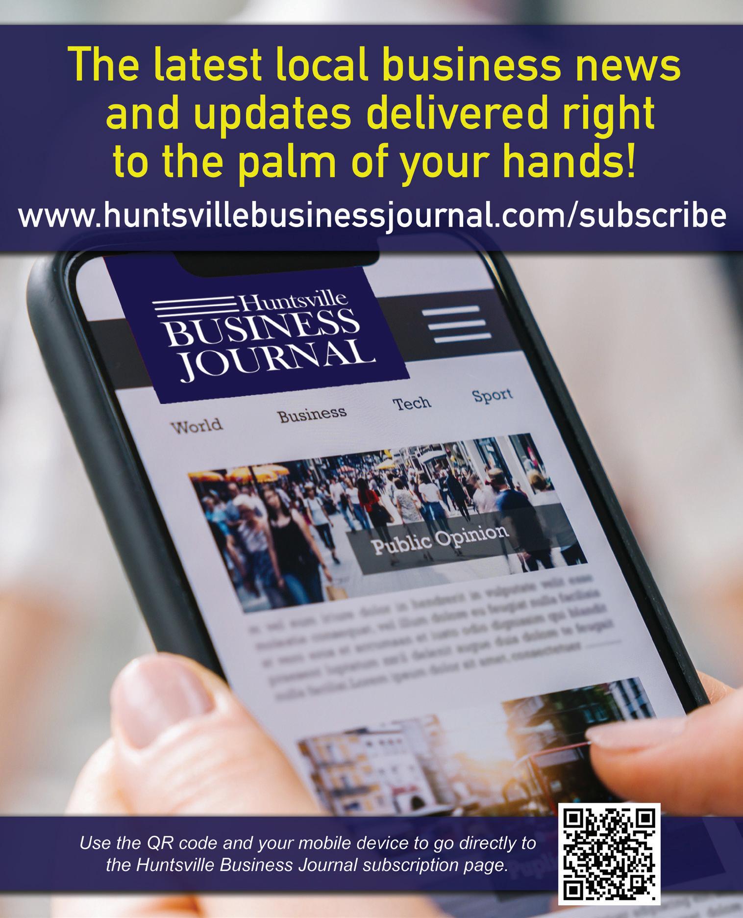 For advertising information call 256.533.8078, e-mail todd@eventhuntsville.com, or visit us on the web at www.huntsvillebusinessjournal.com For editorial information contact editor@huntsvillebusinessjournal.com