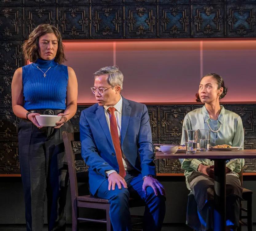 A: Carolina Đỗ, Định James Đoàn and Resident Company Member Tuyết Thị Phạm in the world premiere of Dinner and Cake (2022).
