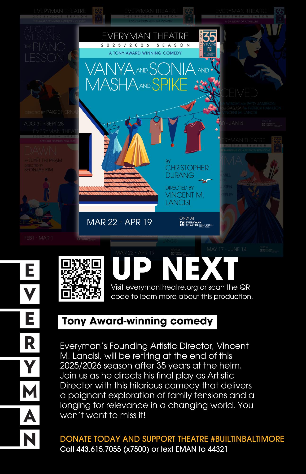 By investing in new work and local voices, Everyman helps ensure that Baltimore isn’t just a stop along the way, but a place where stories are born. A place where theatre is made with intention, integrity, and a deep sense of belonging.