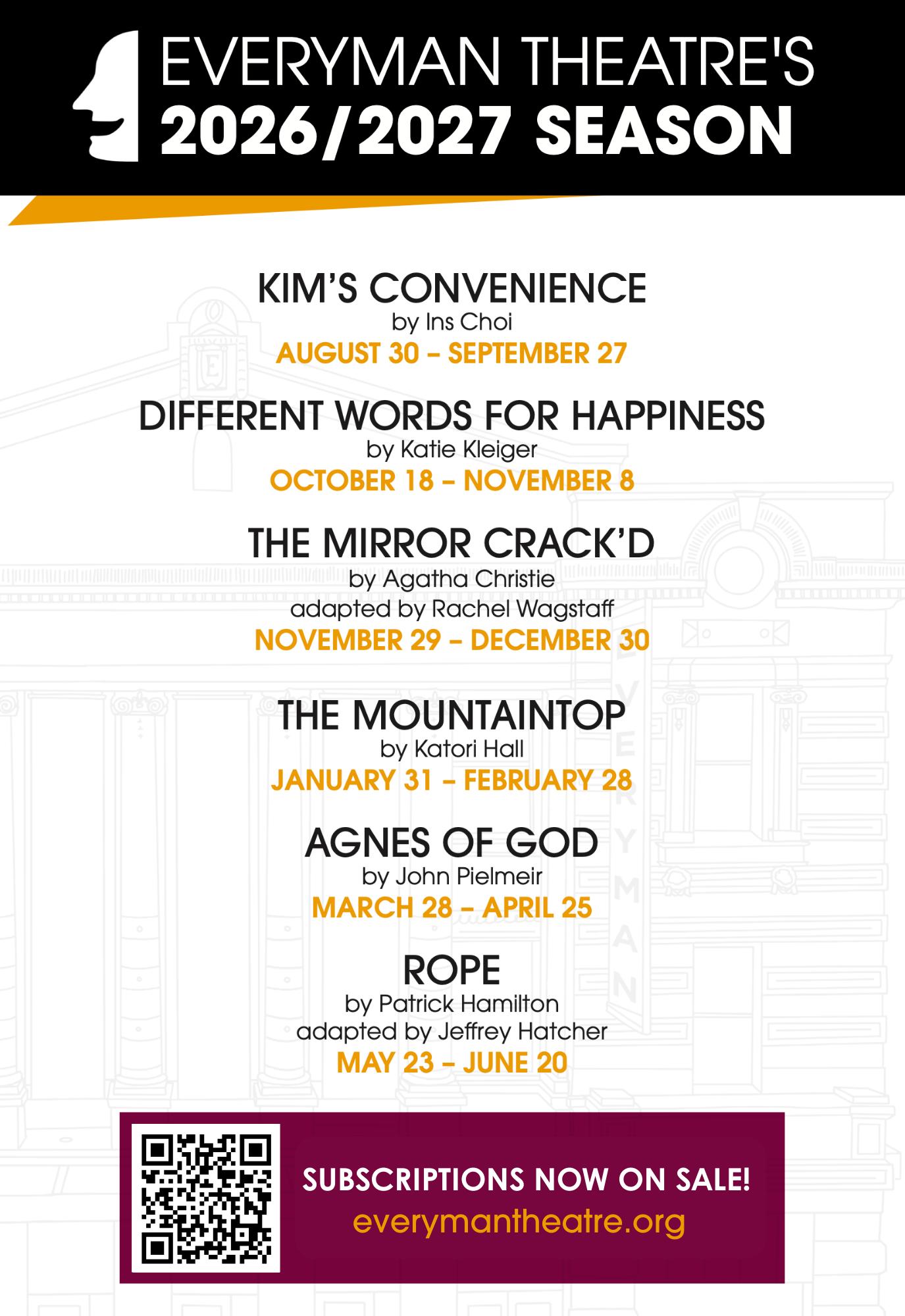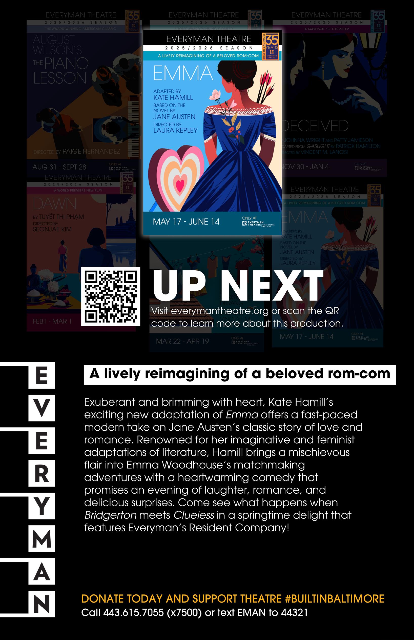 This production also marks the end of an era at Everyman Theatre, with Vinny Lancisi, our beloved Founding Artistic Director, who has been my friend and colleague for the past six years, directing his final play as Artistic Director. I am grateful for all his leadership and guidance, and I will forever admire what he has established here. I am also filled with gratitude for the strong future he has enabled, including a final gift to all of us: the 2026/2027 season! Curating the perfect Everyman season is a behemoth, multi-faceted task: choosing a diverse mix of stories that resonate, are relevant, and highlight the talents of our Resident Company balanced with securing rights, scheduling with our artists, budgeting, and integrating student and community programming. It’s a monumental undertaking and Vinny has assembled a quintessential Everyman season for next year.