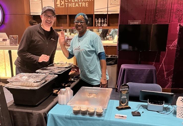 D: Resident Company Member Bruce Nelson and Sumayyah Bilal, owner of our community partner Codetta Bake Shop, in the lobby before a Script Tease Reading.