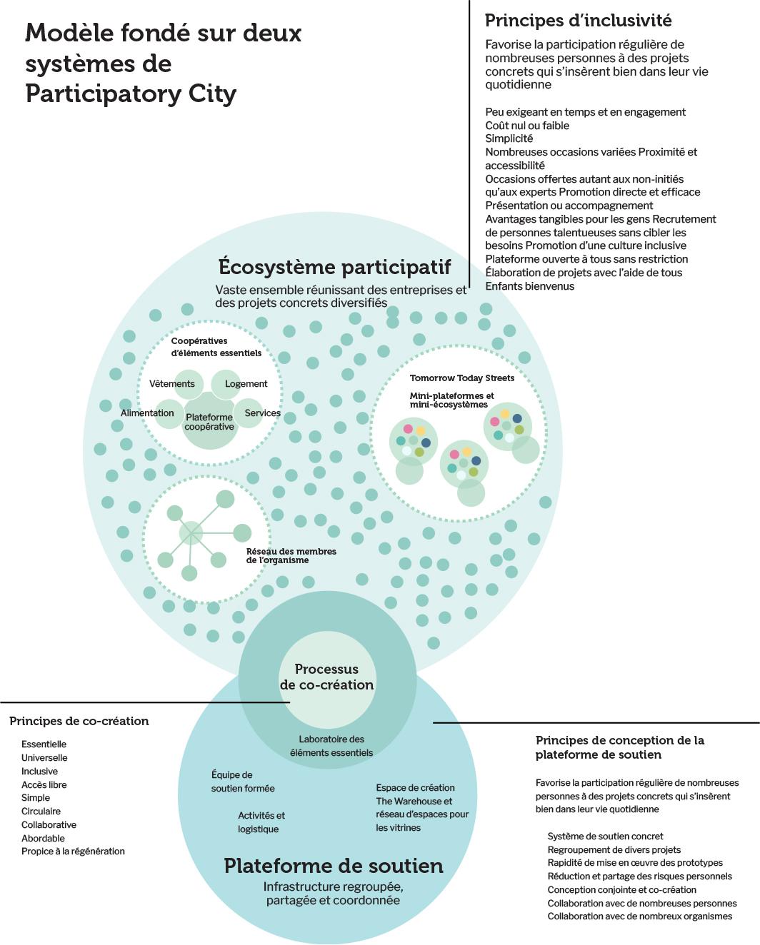 L’organisme Participatory City a élaboré une approche systémique innovante sur une période de 11 ans en vue d’intégrer la participation pratique au cœur même de la vie quotidienne. Cette approche combine des systèmes, des méthodes, des infrastructures et des stratégies qui ont donné lieu à des moyens uniques de créer conjointement une participation inclusive dans les quartiers, les arrondissements et les villes. Au plus haut niveau, ces nouveaux systèmes participatifs sont conçus pour appuyer la transition vers un mode de vie plus sain, équitable et durable (et régénérateur). Il n’est pas question que cela ne soit qu’un ajout agréable aux grandes infrastructures sociales. Ces systèmes sont indispensables dans toutes les communautés, comme nous l’ont dit à plusieurs reprises les résidentes et résidents avec qui nous avons collaboré. Ils existent pour qu’il soit facile de participer à des activités pratiques, utiles, agréables et inclusives au sein même des quartiers. Ils ne reposent pas sur des gens extraordinaires ou des héros. Au contraire, ils peuvent faire partie de la vie de tous les jours pour que les communautés en tirent de nombreux Bienavantages.qu’il soit possible d’établir des comparaisons avec les approches de création de communautés, l’approche de l’organisme Participatory City est unique, car elle place les gens et leurs compétences au cœur même de la création conjointe d’une nouvelle façon de vivre ensemble. Nos recherches à ce jour sur l’impact d’une participation continue et répétée dans le cadre de l’initiative Every One Every Day montrent qu’une telle participation nourrit une capacité d’agir individuelle et collective. Celle-ci se manifeste par des gens s’adonnant ensemble à des activités pratiques et utiles de la vie quotidienne.