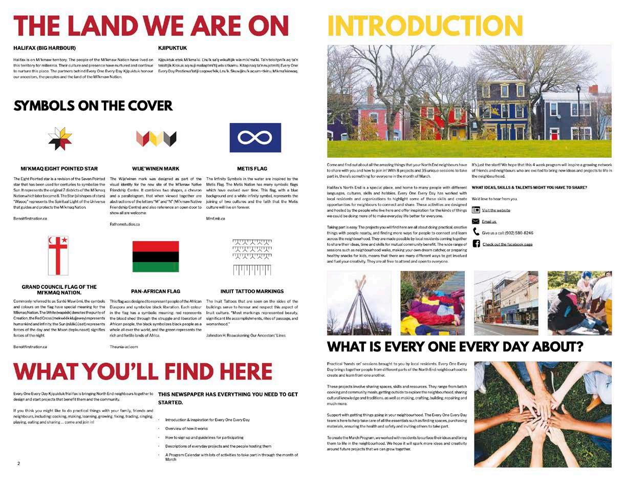 projet Every One Every Day Kjipuktuk-Halifax, nous avons travaillé fort pour répondre aux Appels à l’action de la Commission de vérité et réconciliation du Canada. Nous avons intégré ces appels à même notre plateforme pour qu’ils servent de moteur pour repenser et unir nos communautés. Nous avons une chance bien réelle d’éduquer les gens et de bâtir des communautés plus fortes et résilientes pour l’avenir. Le projet soulève l’importance des infrastructures sociales pour aider à bâtir de telles communautés. Il est crucial pour l’avenir, sur les plans individuel et gouvernemental, mais aussi pour le tissu social même du pays. Grâce à de tels investissements, il existera des lieux où tout le monde pourra se sentir bienvenu et en sécurité.