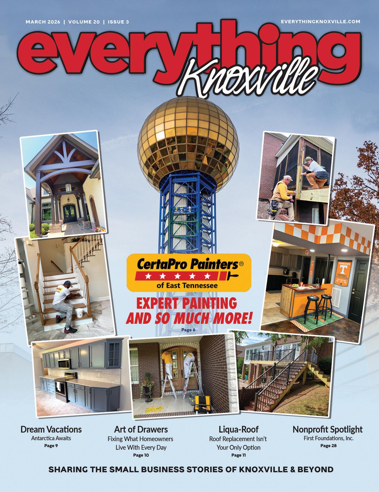 AS MANY OF you may know, CertaPro Painters of East Tennessee has been painting homes and businesses in our area for more than 20 years. Their familiar logo-wrapped vehicles have been seen in numerous neighborhood driveways, as well as the UT Vols practice facility and the base of the iconic Sunsphere. Their extensive capabilities, breadth of experience, and business longevity can be attributed to the company’s certainty promise of a “job well done.” This promise comes directly from a consistent presentation of their job expectationsfrom required supplies to project timeline - making CertaPro Painters a go-to for many residential and commercial property improvements.