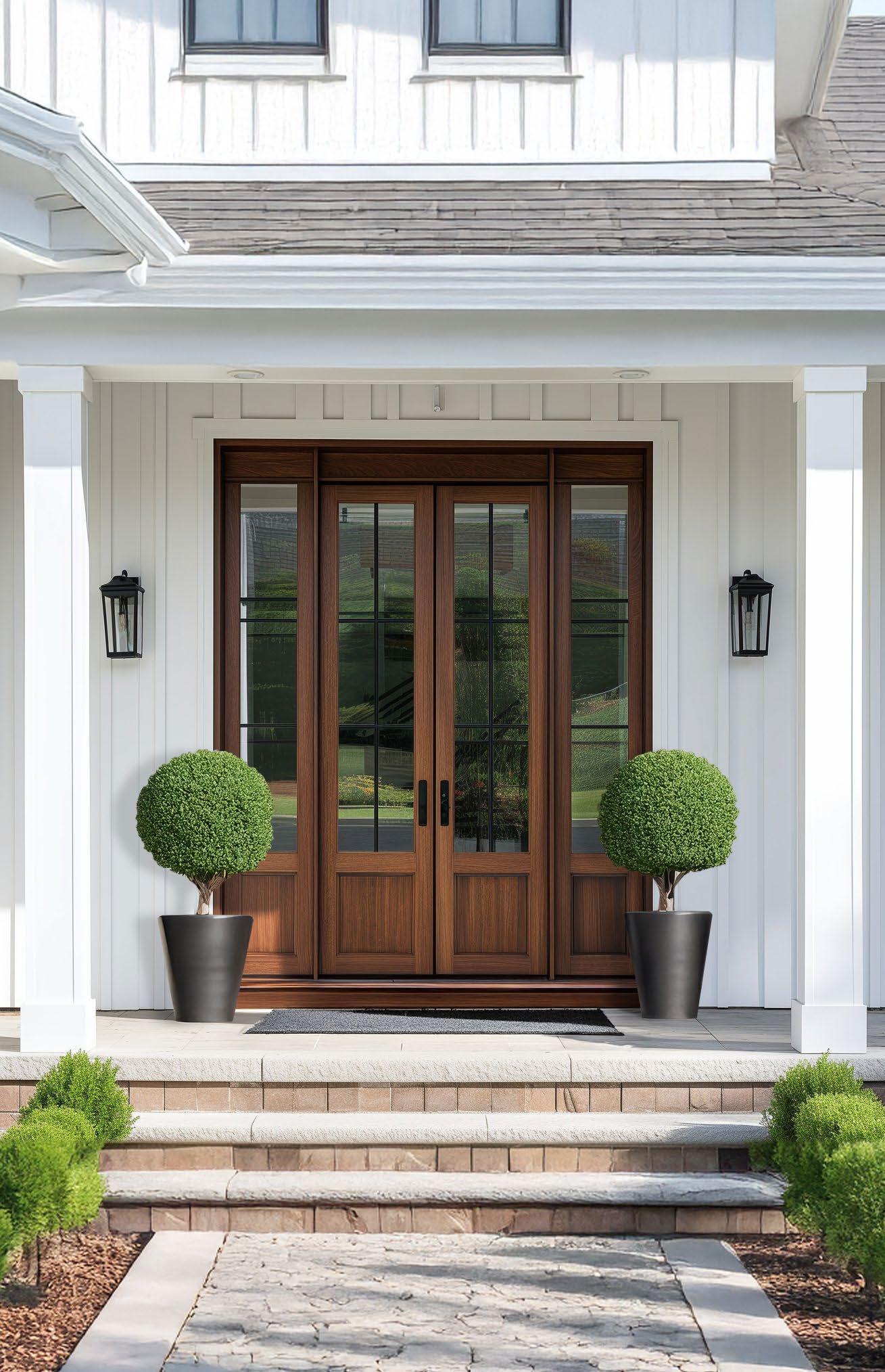 Consejo profesional de Jennifer Adams: Los elementos simples y naturales, como macetas simétricas o un banco de porche ordenado, pueden elevar su entrada y ofrecer una sensación de equilibrio y calma antes de entrar.