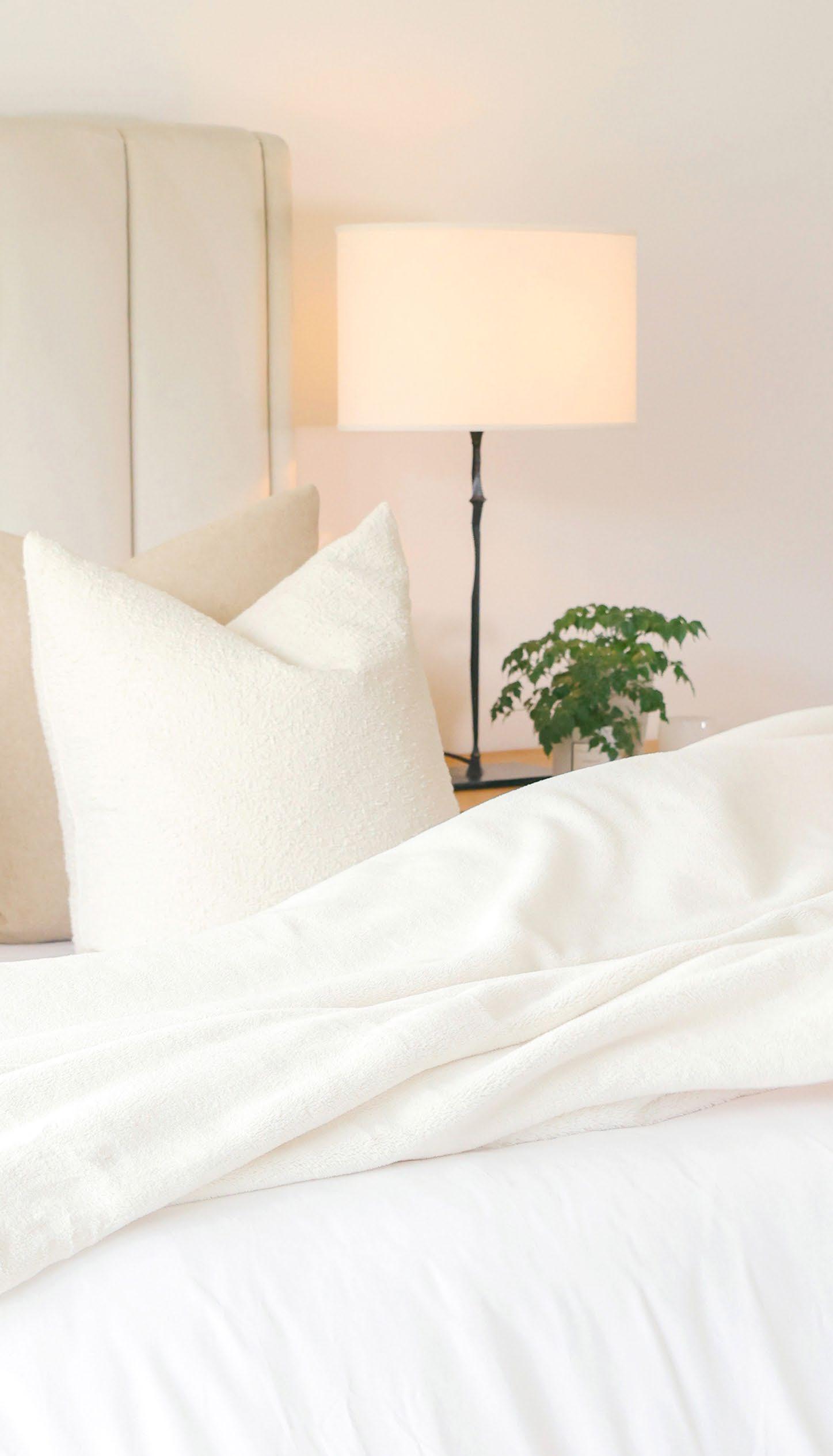 Consejo profesional de Jennifer Adams: use ropa de cama blanca inmaculada y toallas blancas esponjosas para brindar una experiencia similar a la de un hotel. Retire cualquier patrón que distraiga de la ropa de cama, las almohadas y las cortinas de la ducha.