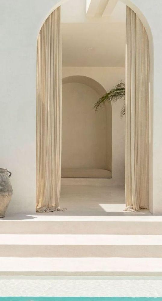 Diana Royal flooring. Plaster matte walls. Iron railing with plaster low wall. Stained wood treads and risers. Plaster closet door. Accents in Zellige tile.