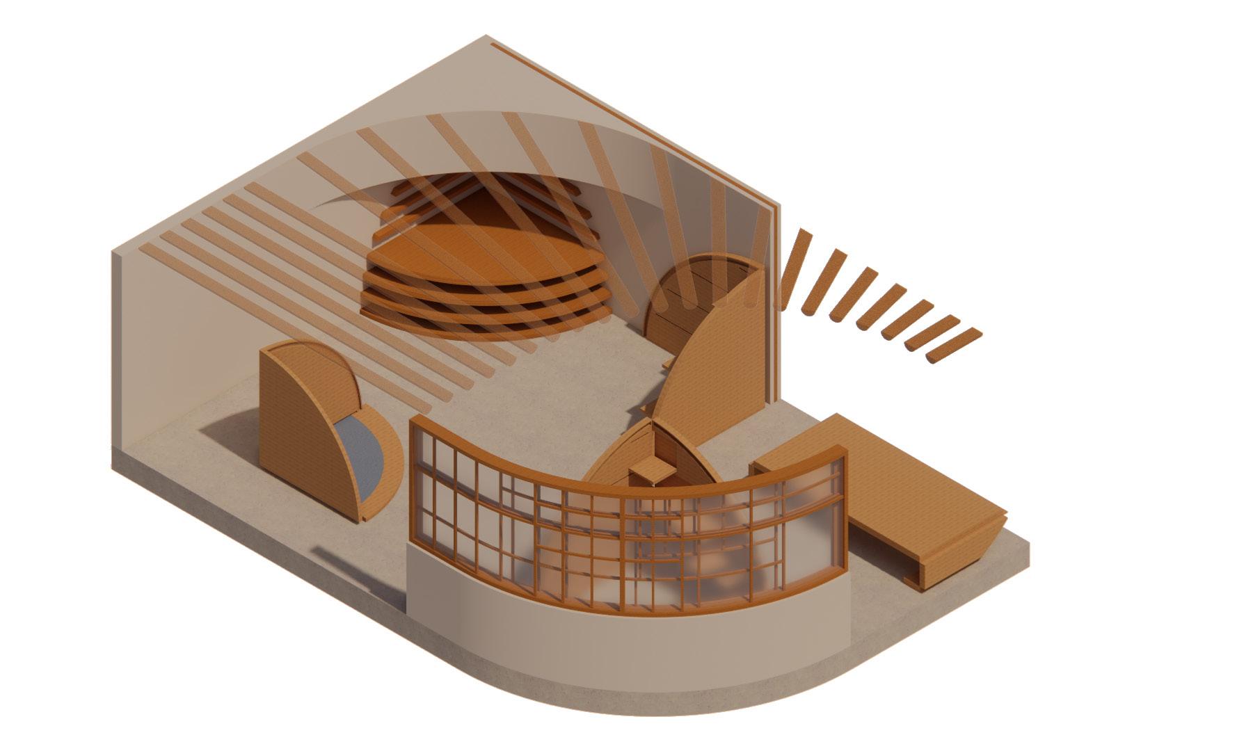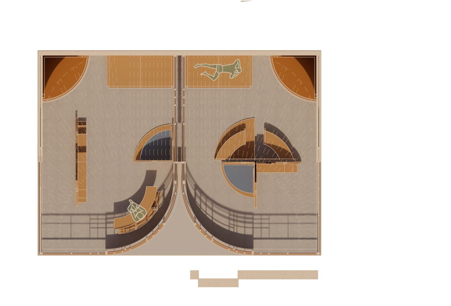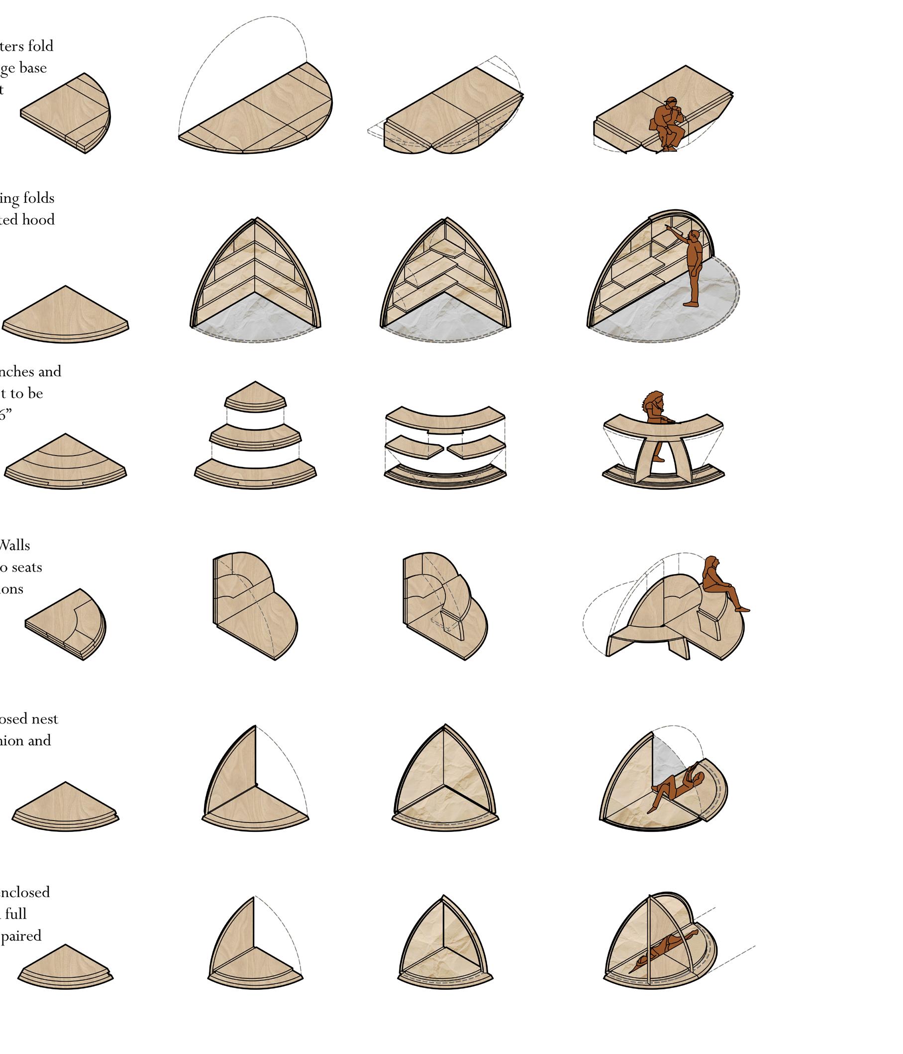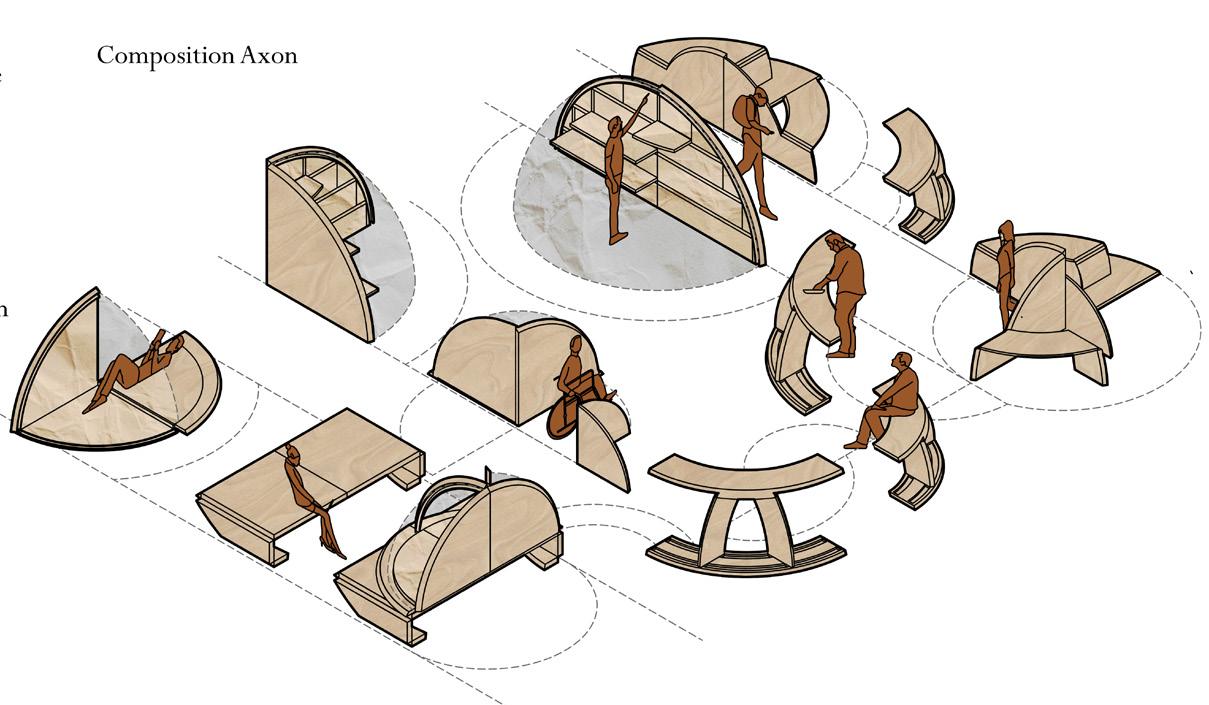 Central to this living system is a redefinition of poche as spine, skin, and boning. The spine organizes circulation and anchors each curved module; the skin mediates privacy, daylight, and acoustic softness; and the boning nests storage and functional surfaces directly into the wall thickness. Through sliding panels, folds, and offsets, residents can expand or contract their personal territories as their needs shift throughout the day.
