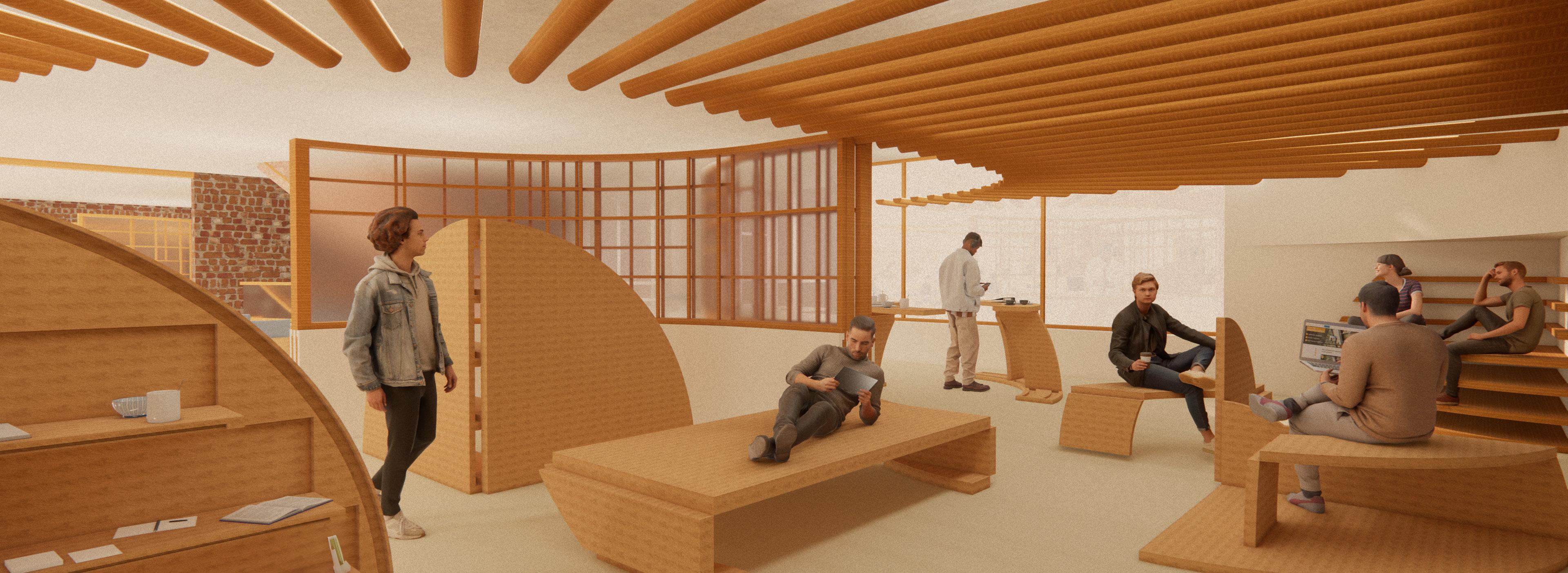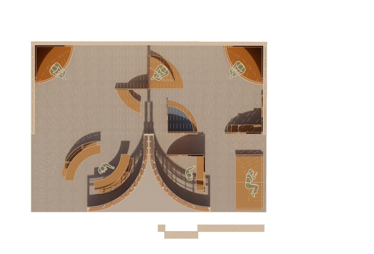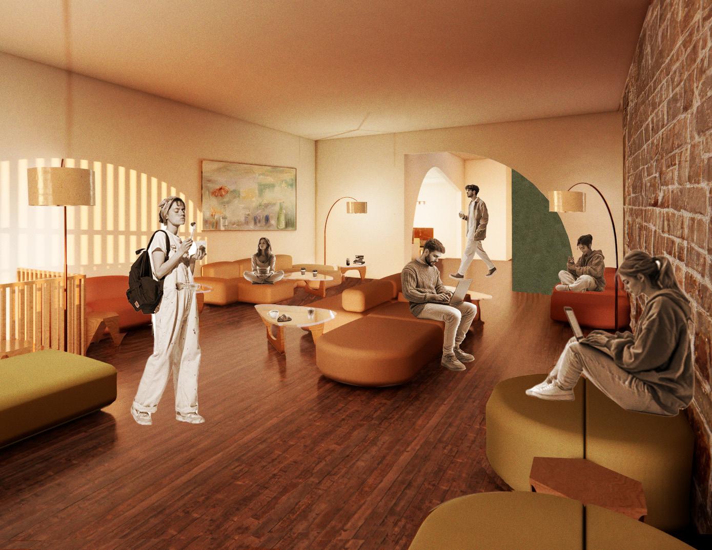 Synaptic Studios reimagines student living as a network of interconnected pockets shaped by curvature, translucency, and adaptive poche. Instead of separating domestic and academic life into rigid compartments, the project uses curved acrylic screens and mirrored geometries to choreograph movement and form soft thresholds between studying, resting, gathering, and making. These arcs guide residents through gradients of semi-private and communal space, encouraging everyday encounters that build shared culture while still providing moments of retreat.