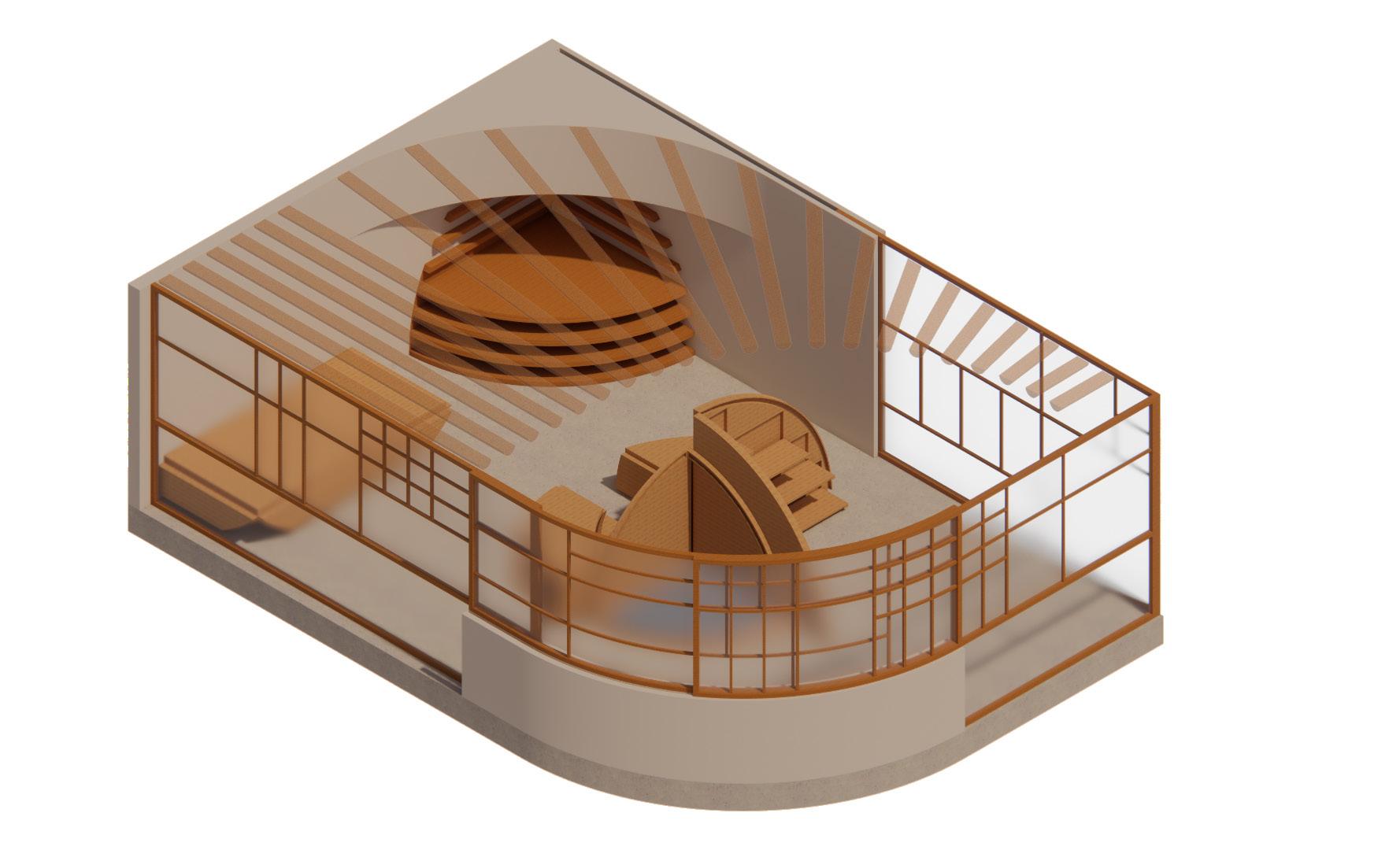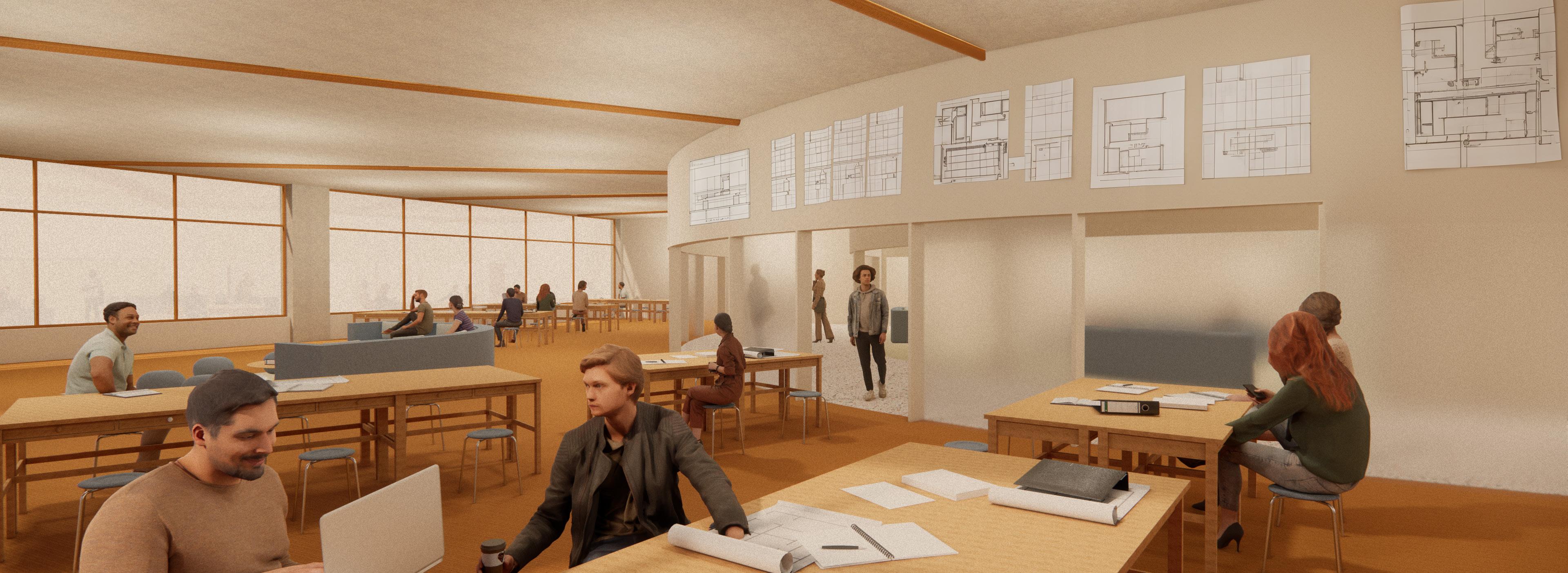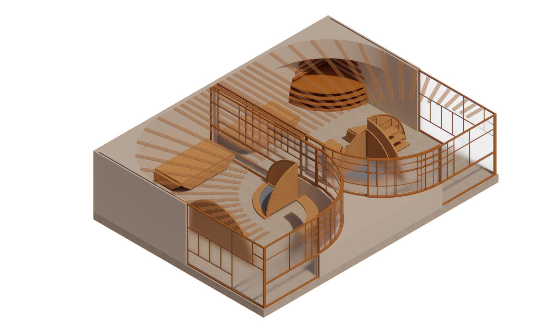 Synaptic Studios reimagines student living as a network of interconnected pockets shaped by curvature, translucency, and adaptive poche. Instead of separating domestic and academic life into rigid compartments, the project uses curved acrylic screens and mirrored geometries to choreograph movement and form soft thresholds between studying, resting, gathering, and making. These arcs guide residents through gradients of semi-private and communal space, encouraging everyday encounters that build shared culture while still providing moments of retreat.